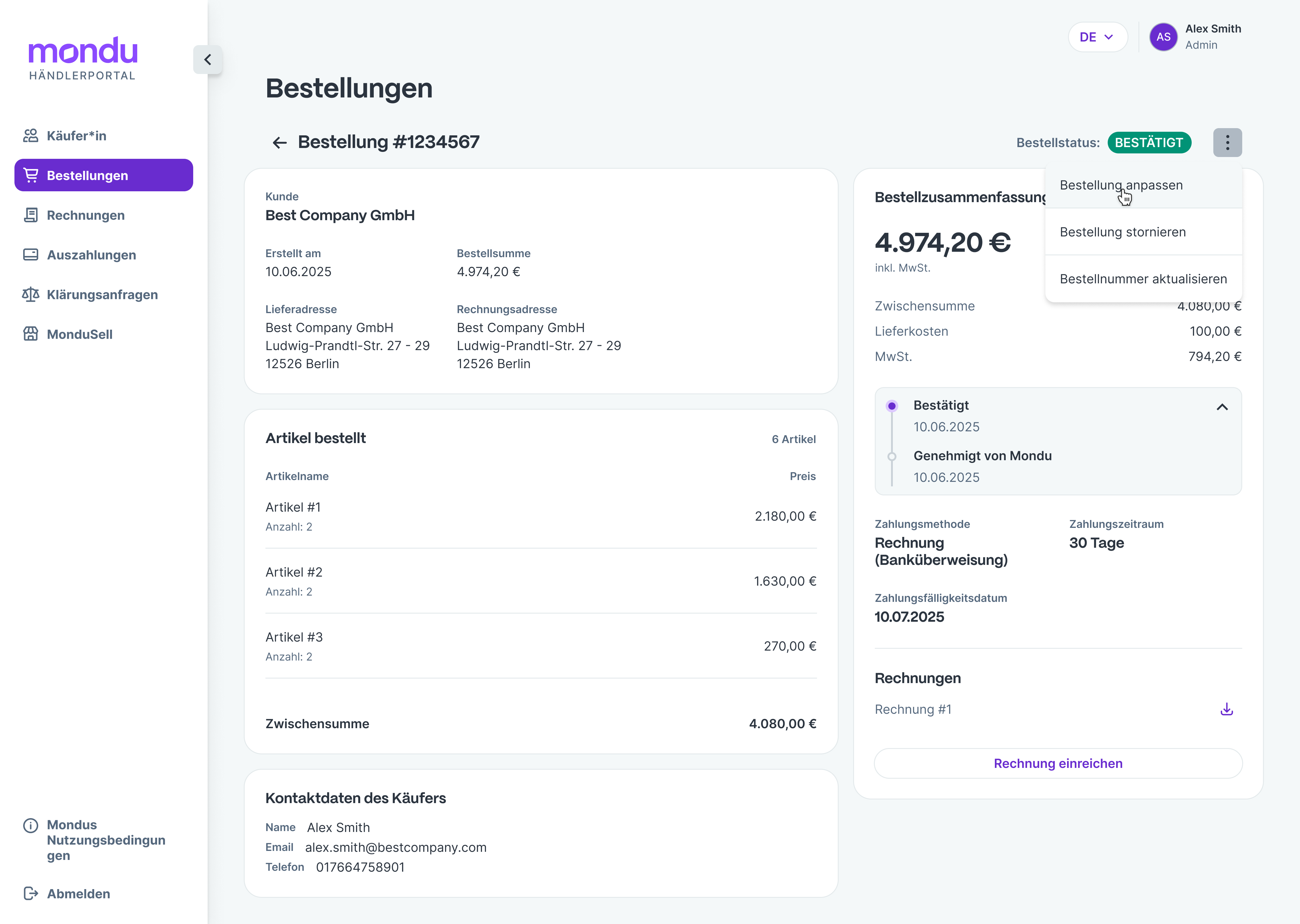 Sie erhalten einen Einblick in die Bestellpositionen, den Bestellstatus sowie weitere Kunden- und Zahlungsdaten. Es ist auch möglich, Bestellungen zu stornieren und anzupassen, sowie eine Rechnung für eine Bestellung zu übermitteln.