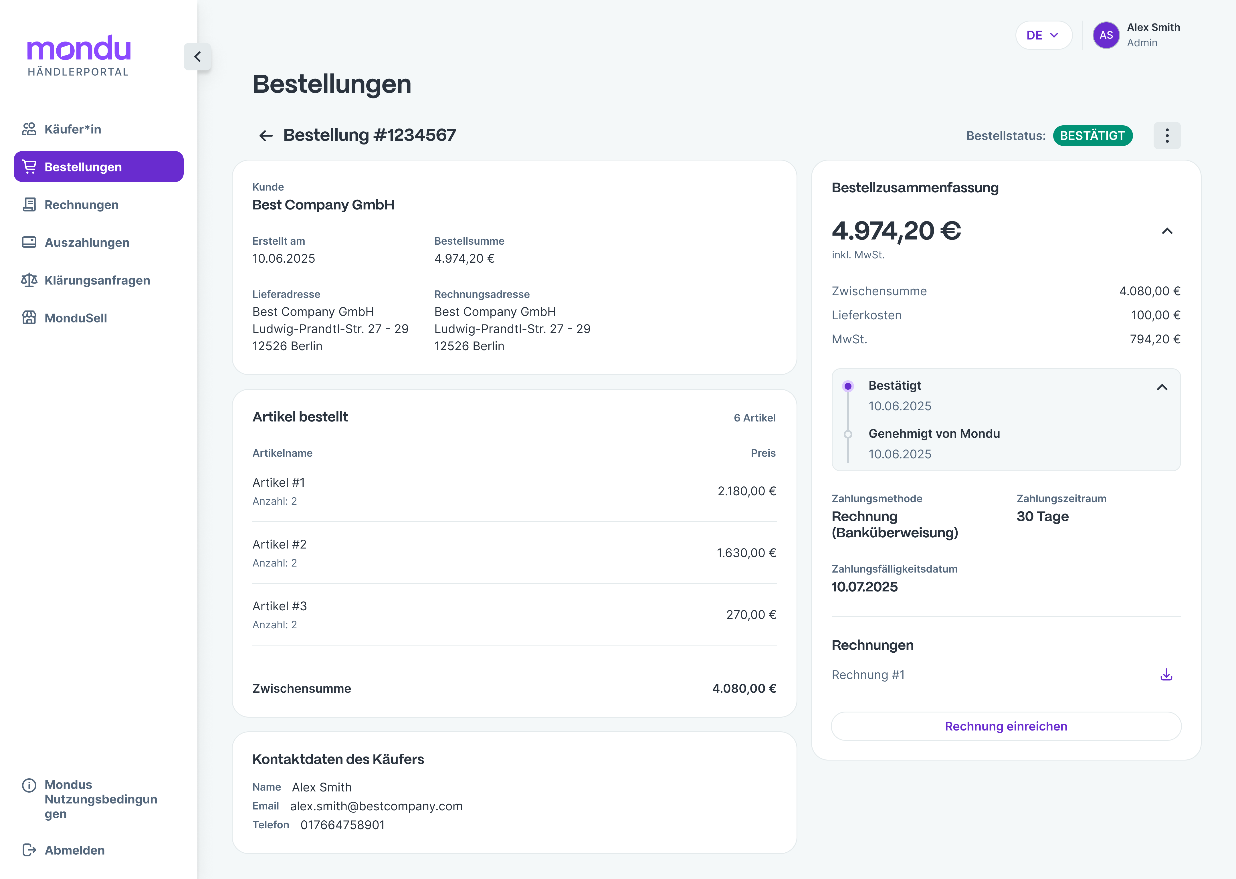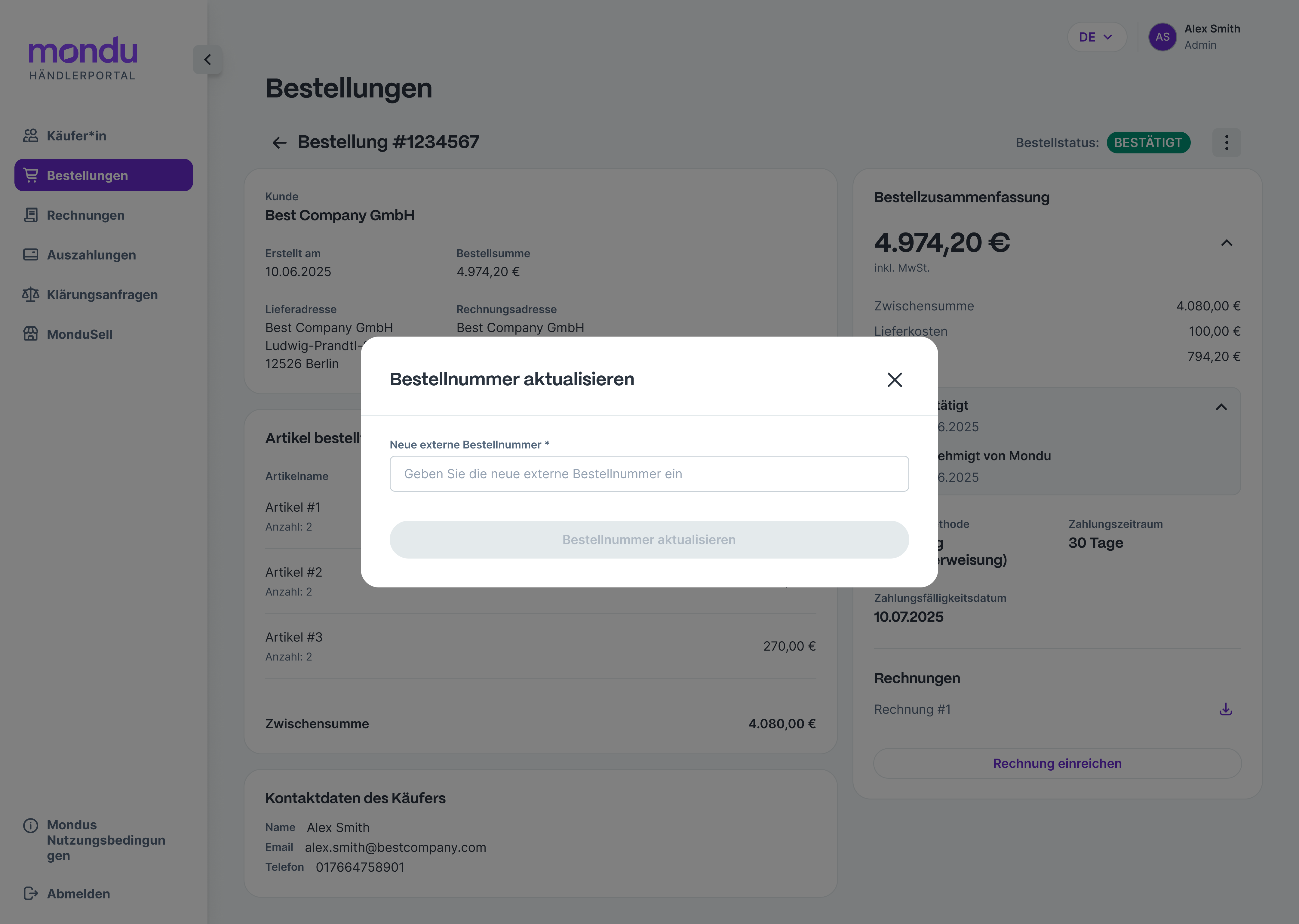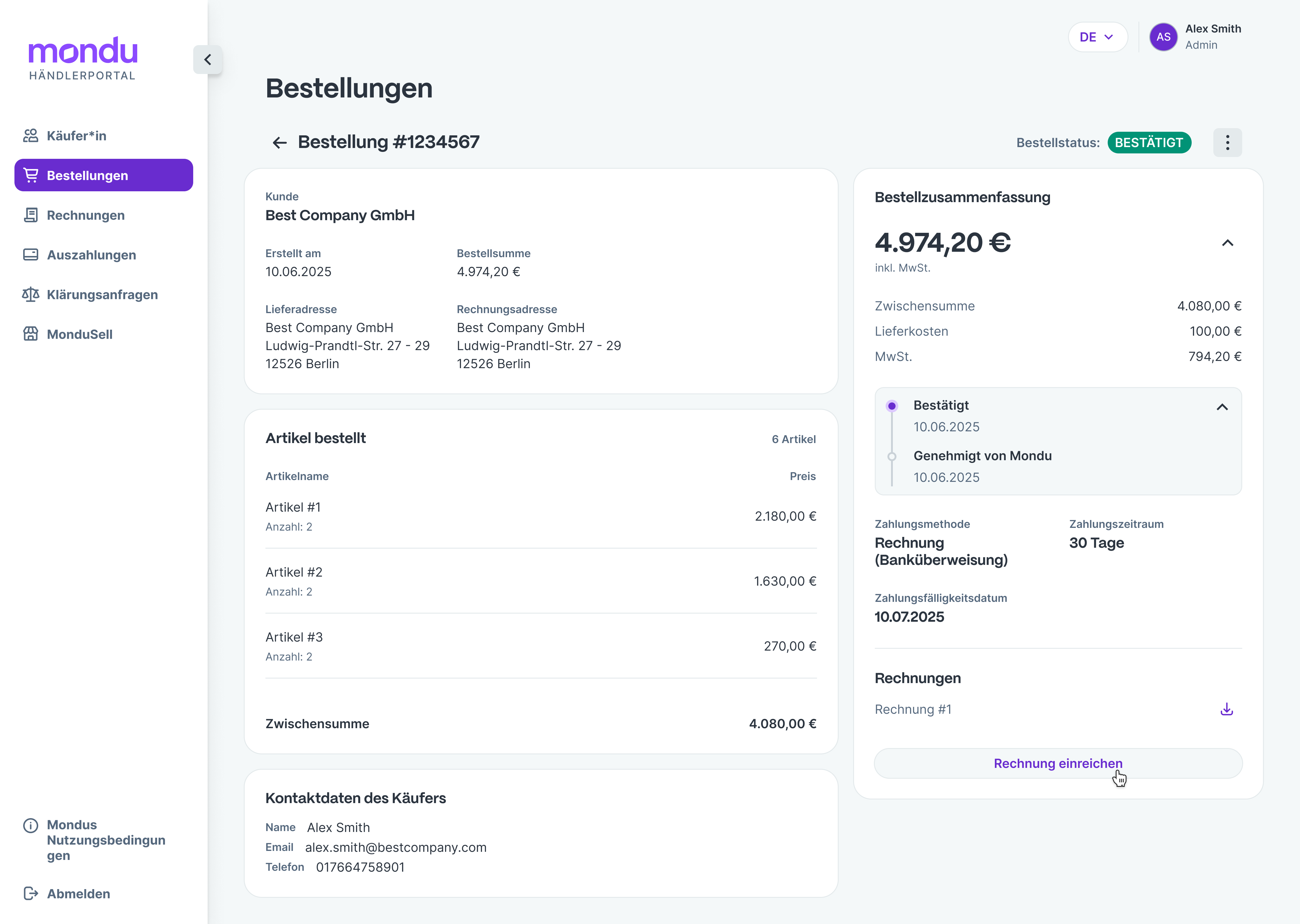 Hinweis: Das Einreichen einer Rechnung löst die Händlerzahlung aus. Es startet auch die Zahlungsfrist des Kunden bei Mondu (z.B. 30 Tage). Der Rechnungsbetrag muss kleiner oder gleich dem Bestellbetrag sein. Um eine Rechnung einreichen zu können, muss die Bestellung den Status "bestätigt", "teilweise versendet" oder "teilweise abgeschlossen" haben.