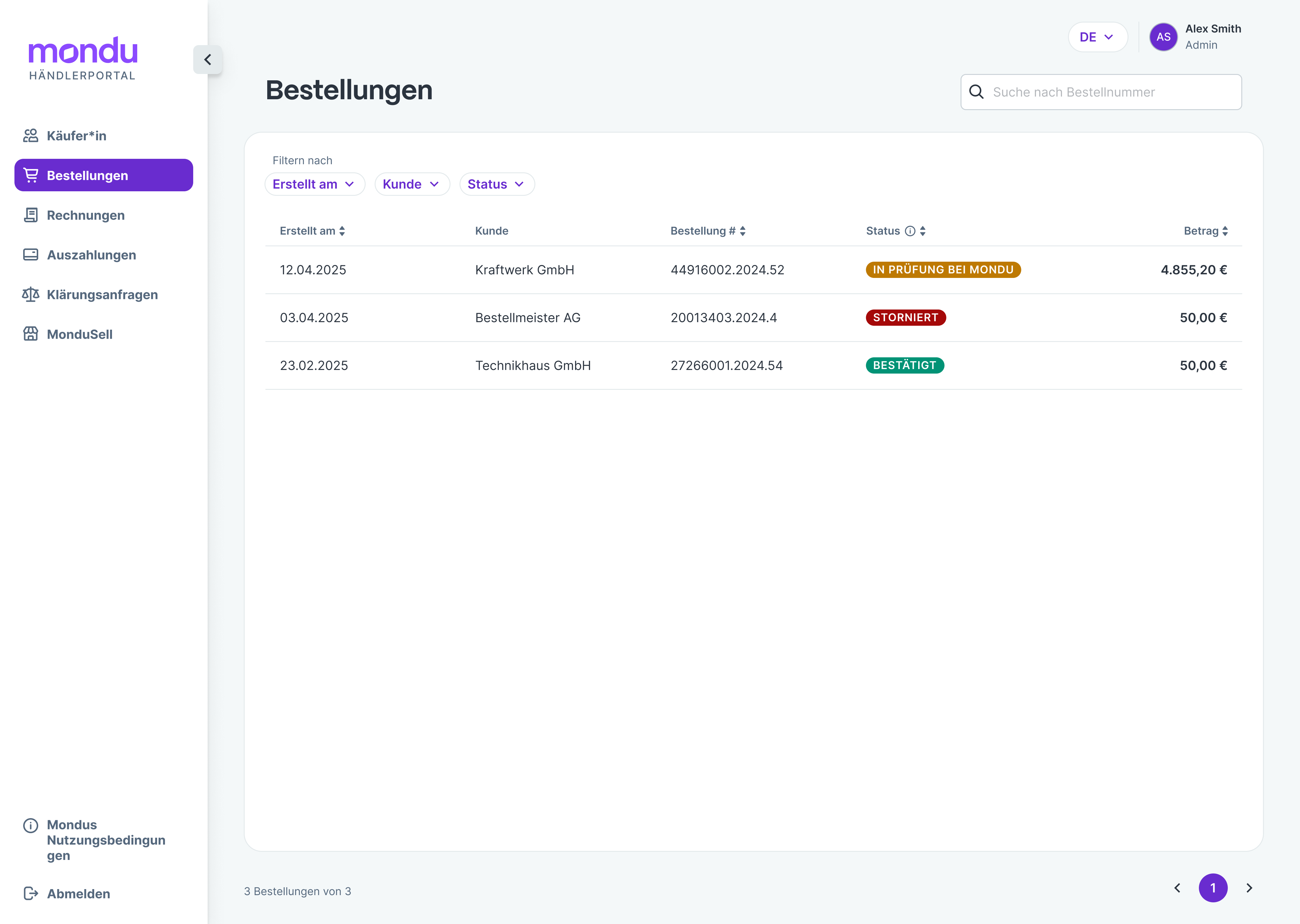 Der Menüpunkt "Bestellungen" zeigt Ihnen alle Bestellungen, die über eine Mondu-Zahlungsmethode getätigt wurden. Dies umfasst Bestellungen aus Ihrem Online-Shop sowie aus MonduSell (Offline).