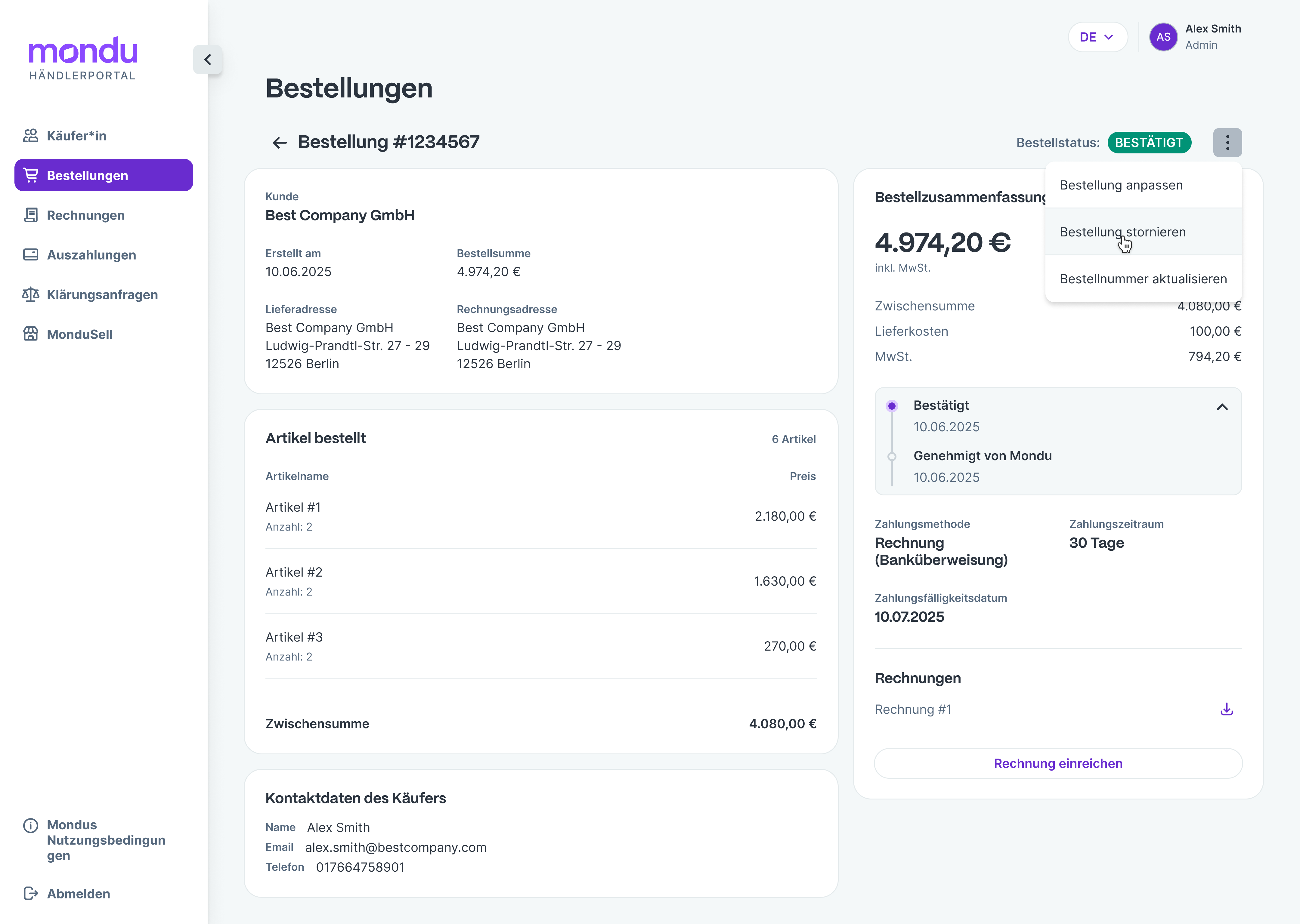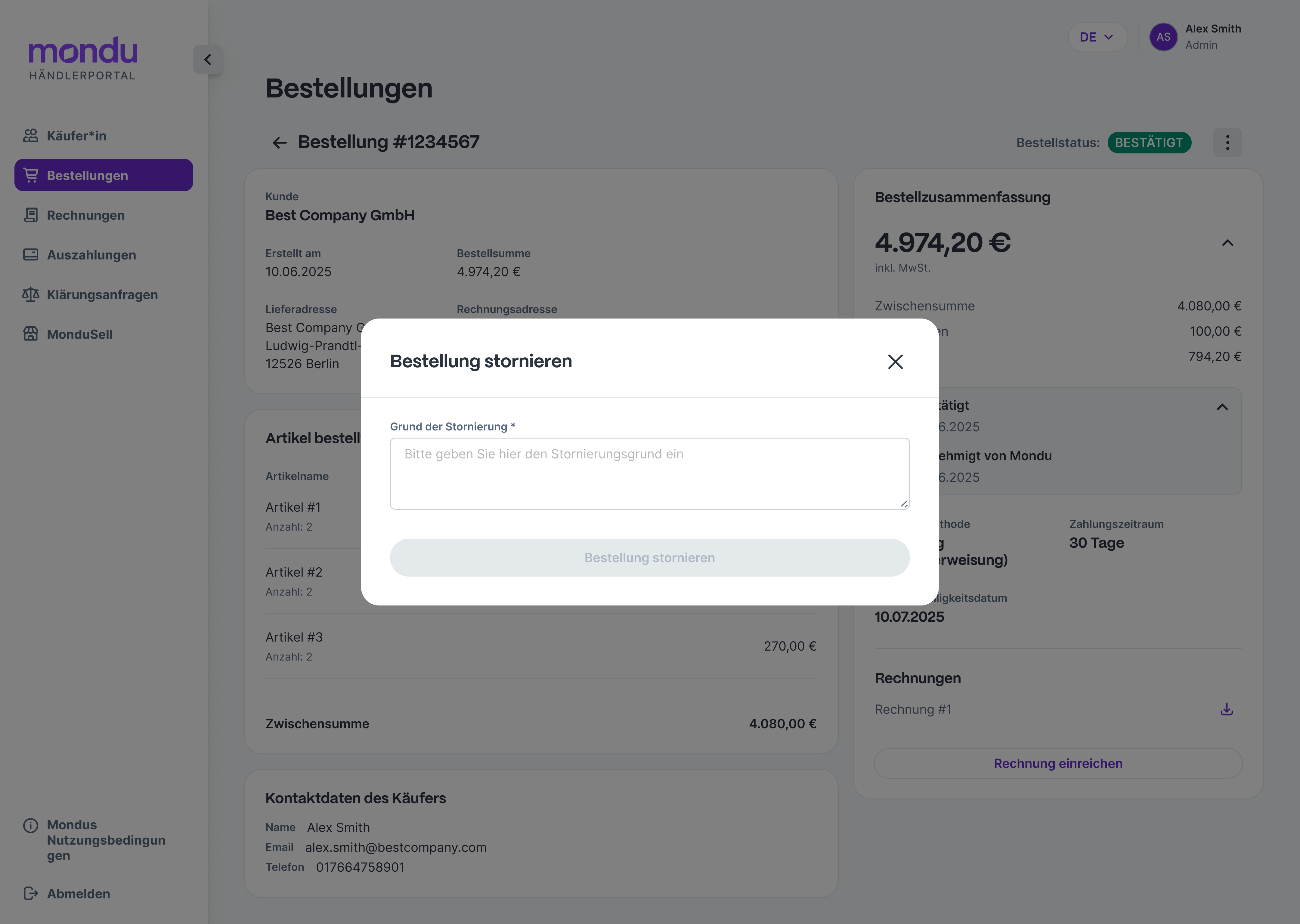 - Die Bestellung ist nun vollständig storniert und kann nicht mehr über Mondu bearbeitet werden.