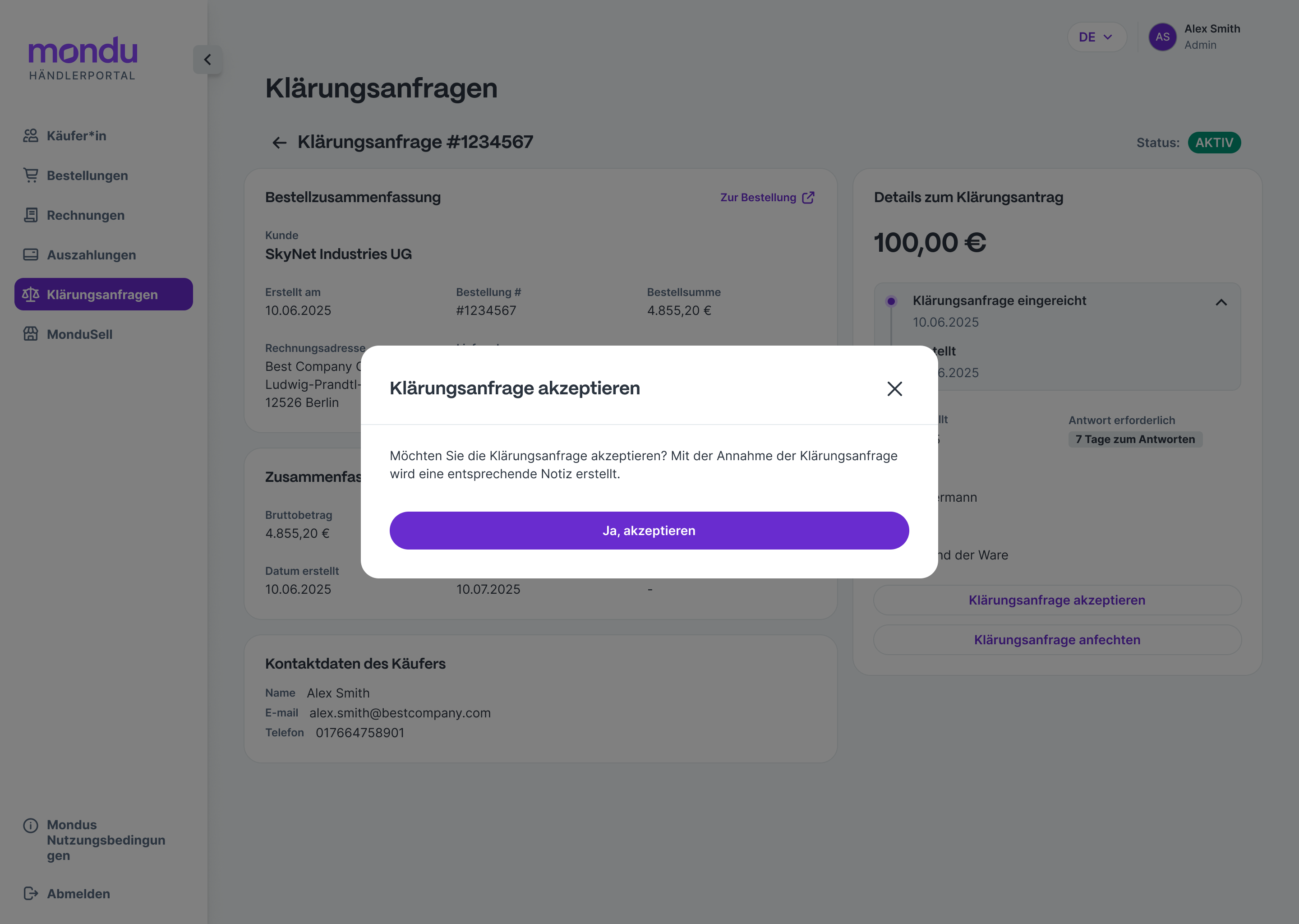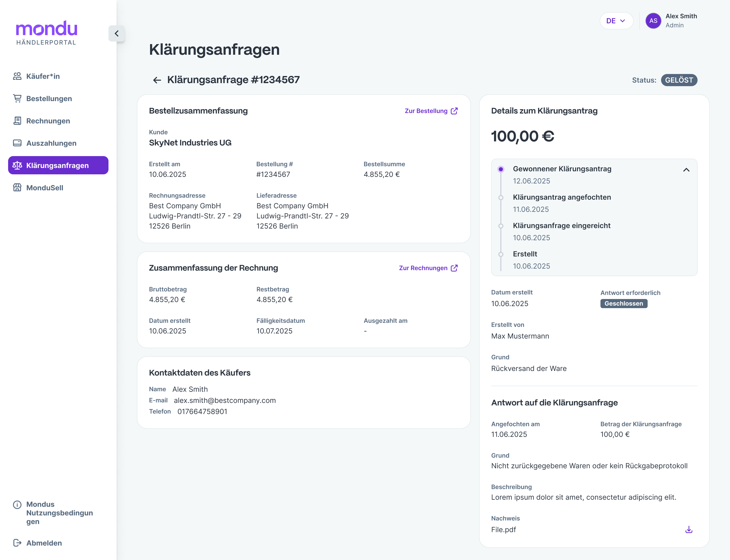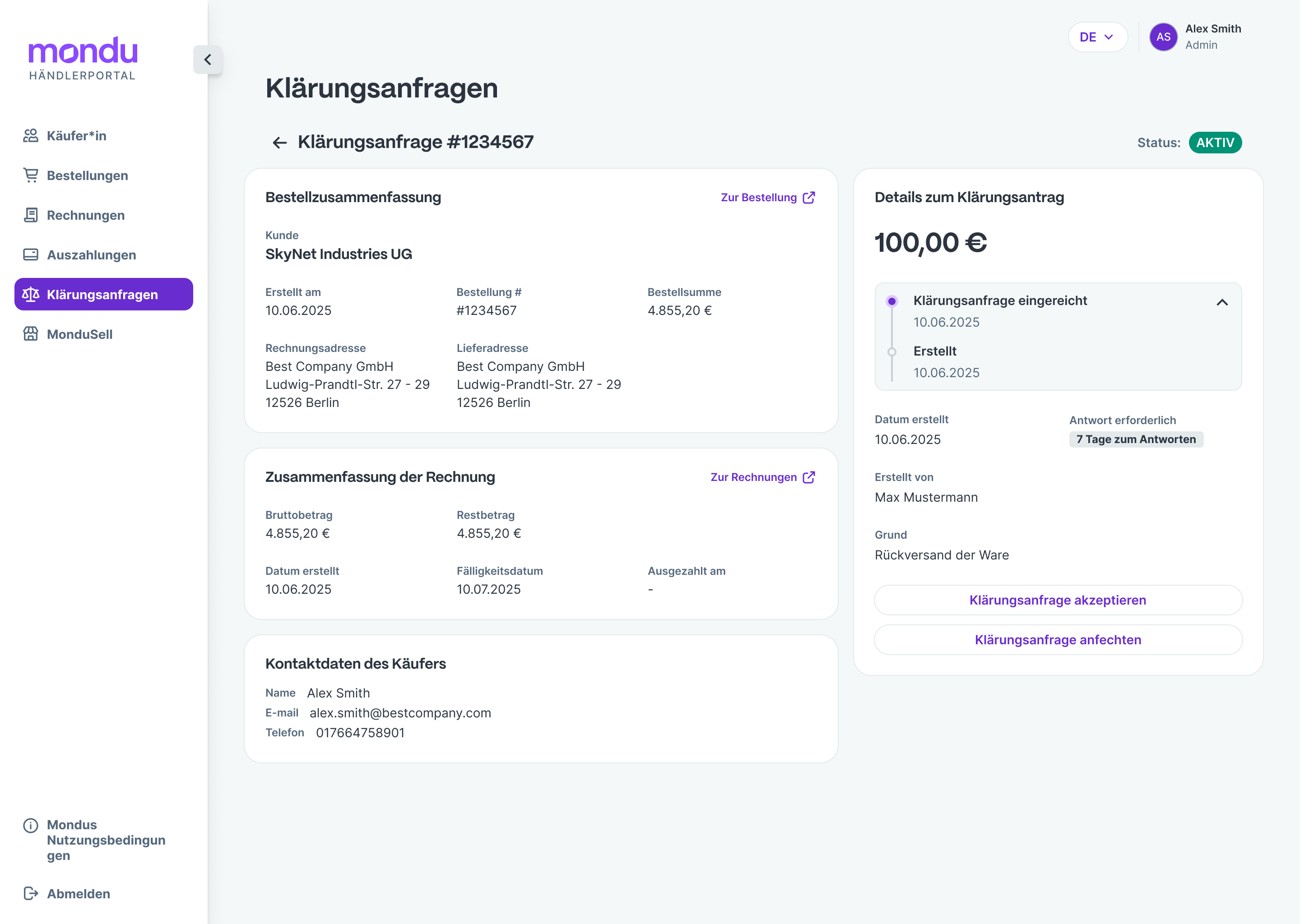 Sobald ein Käufer über das Mondu Käuferportal eine Klärungsanfrage erhebt, ist dieser im Händlerportal sichtbar, und Sie werden per E-Mail benachrichtigt.