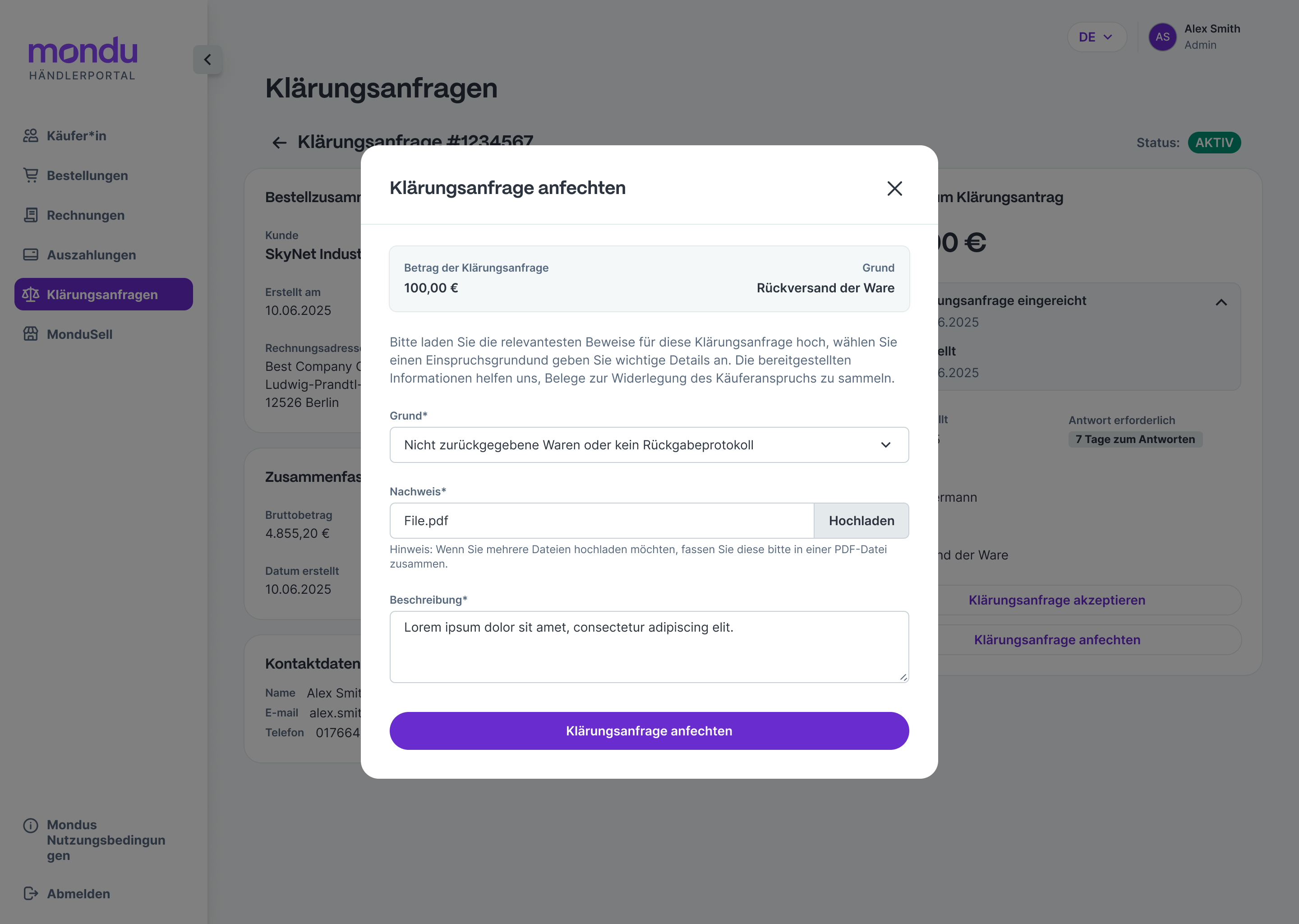 Sobald alle Felder ausgefüllt sind, klicken Sie auf „Klärungsanfrage anfechten“, um die Anfechtung zur Überprüfung an das Mondu Buyer Operations-Team zu übermitteln.