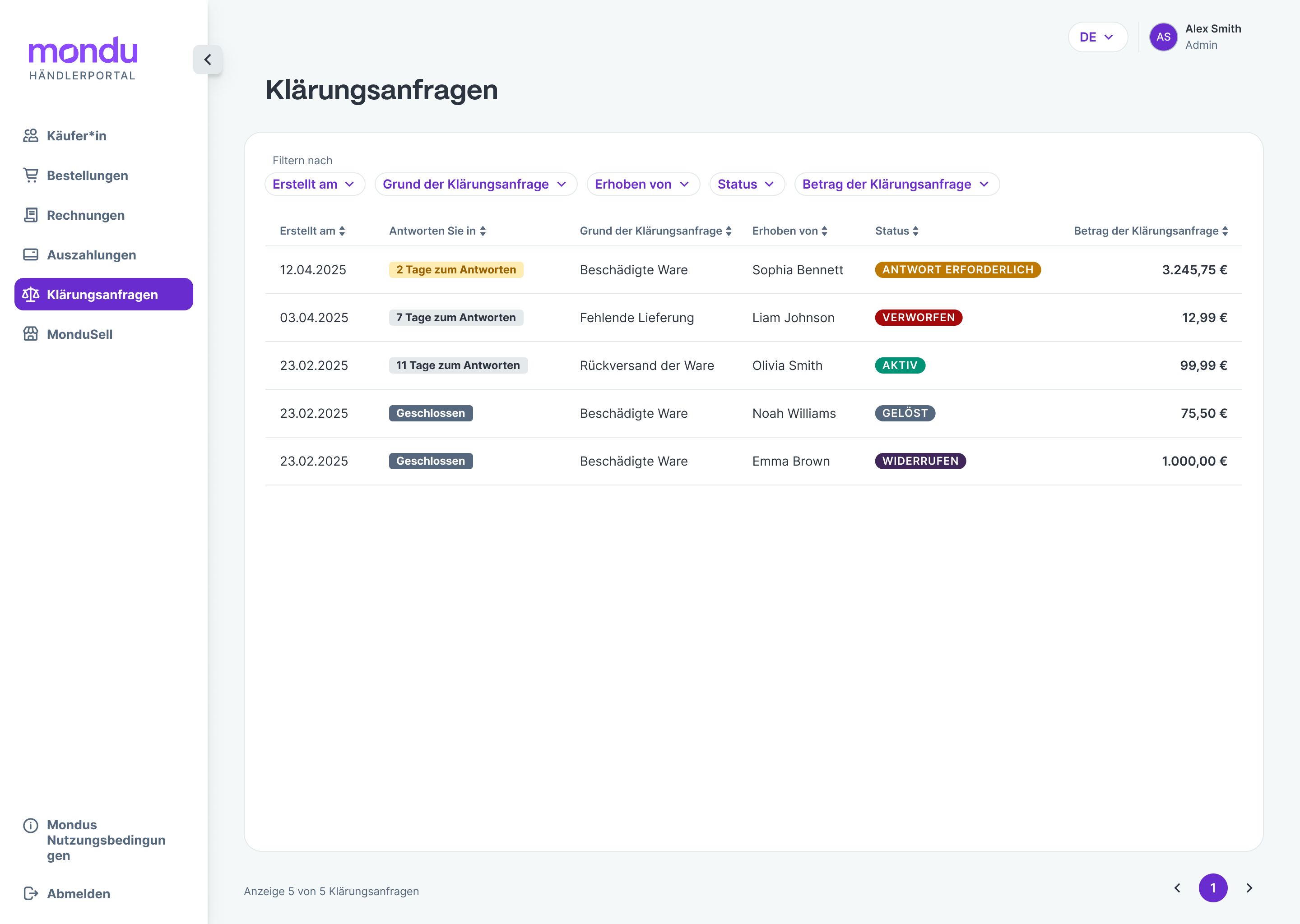 Auf der Seite "Klärungsanfragen" können Sie alle Streitfälle einsehen, die von Käufern erhoben wurden, und sie nach folgenden Fällen filtern: