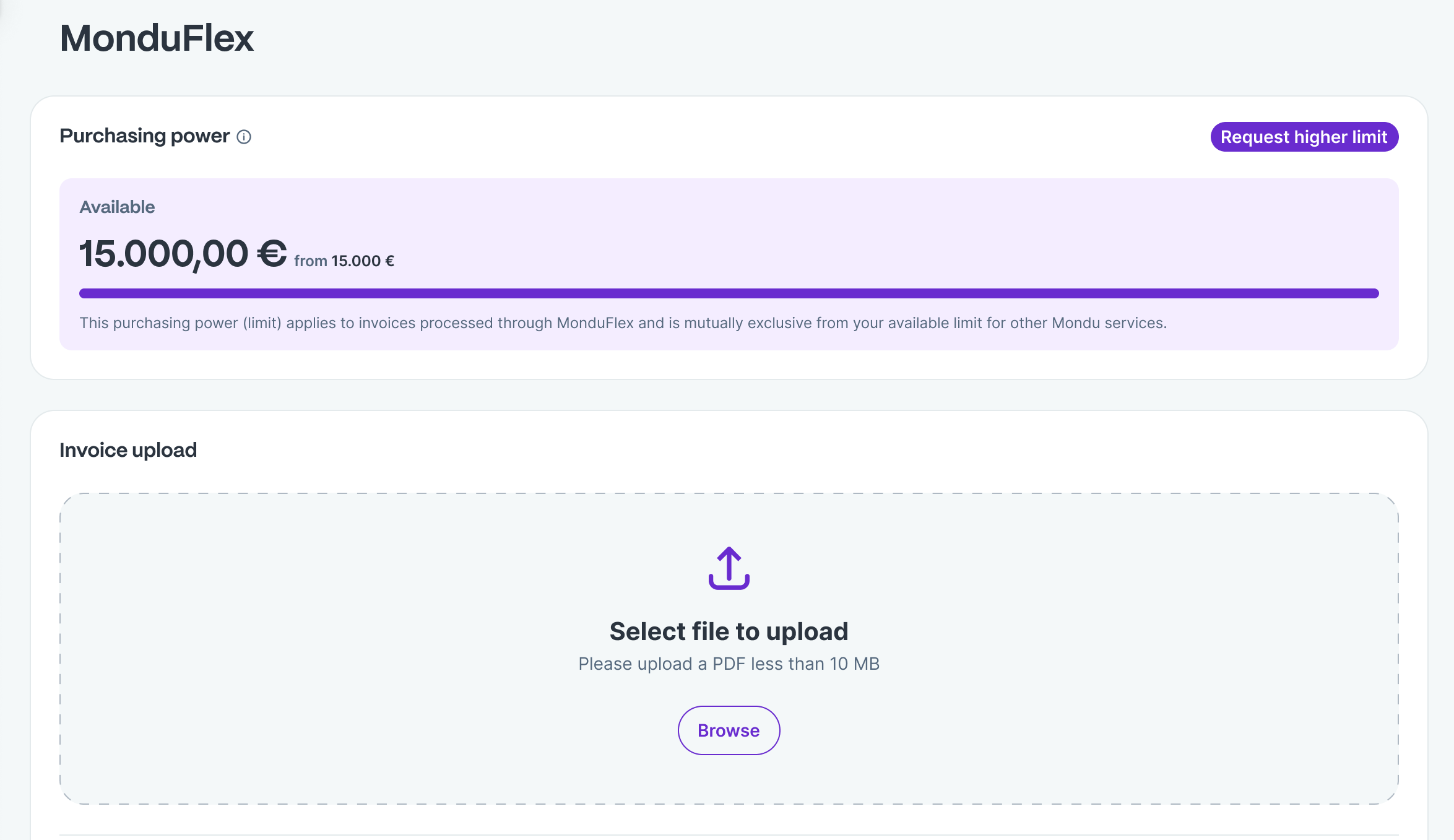 Integrate Mondu's invoice factoring capabilities directly into your platform. Offer your customers the option to submit invoices to Mondu and get paid immediately. Fully embedded in your proprietary platform, Mondu enables your customers to upload invoices on a single invoice basis. Within 12 hours your customer receives an approval for the respected buyer. With a payout within 36 hours after approval, Mondu’s solution ensures secure payout flows and steady cash flows.