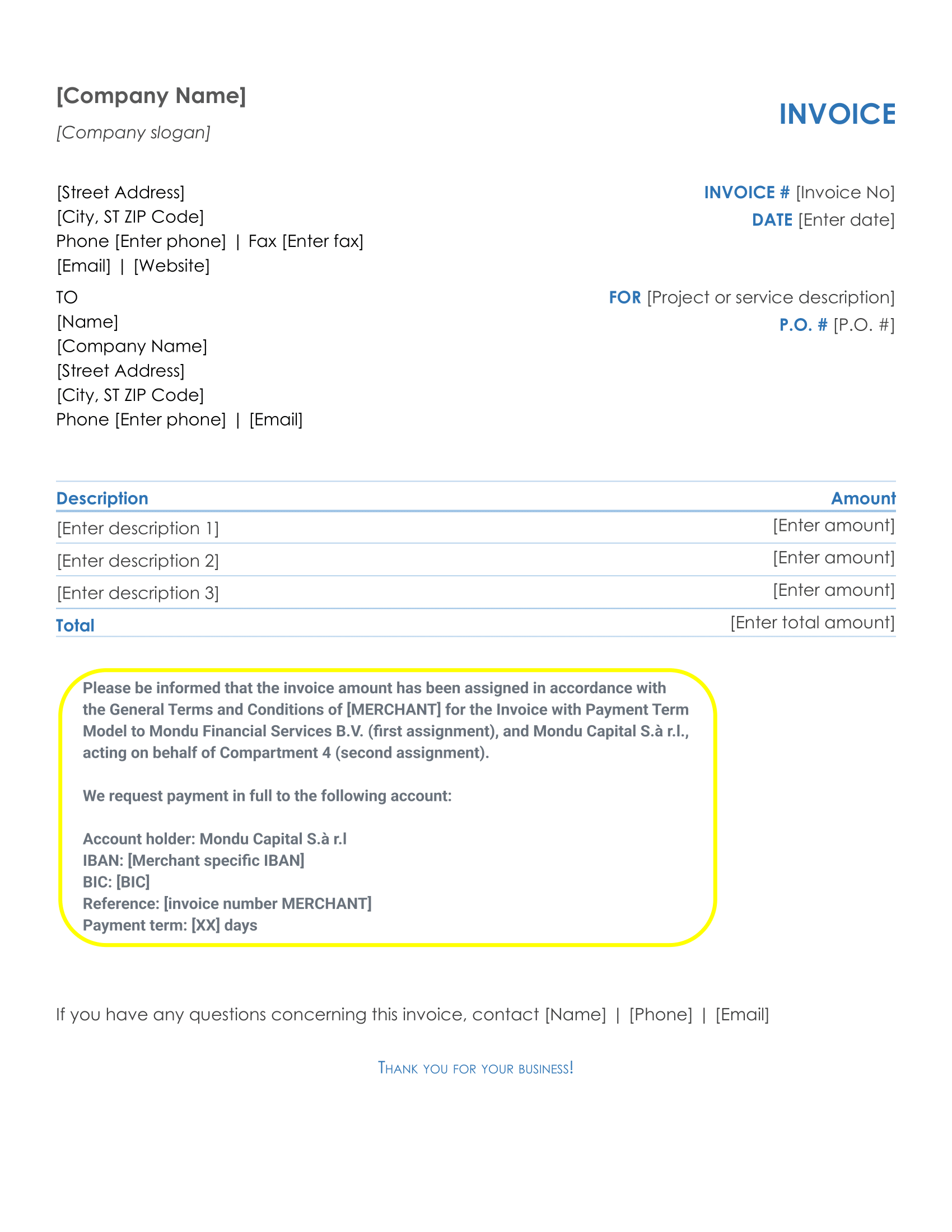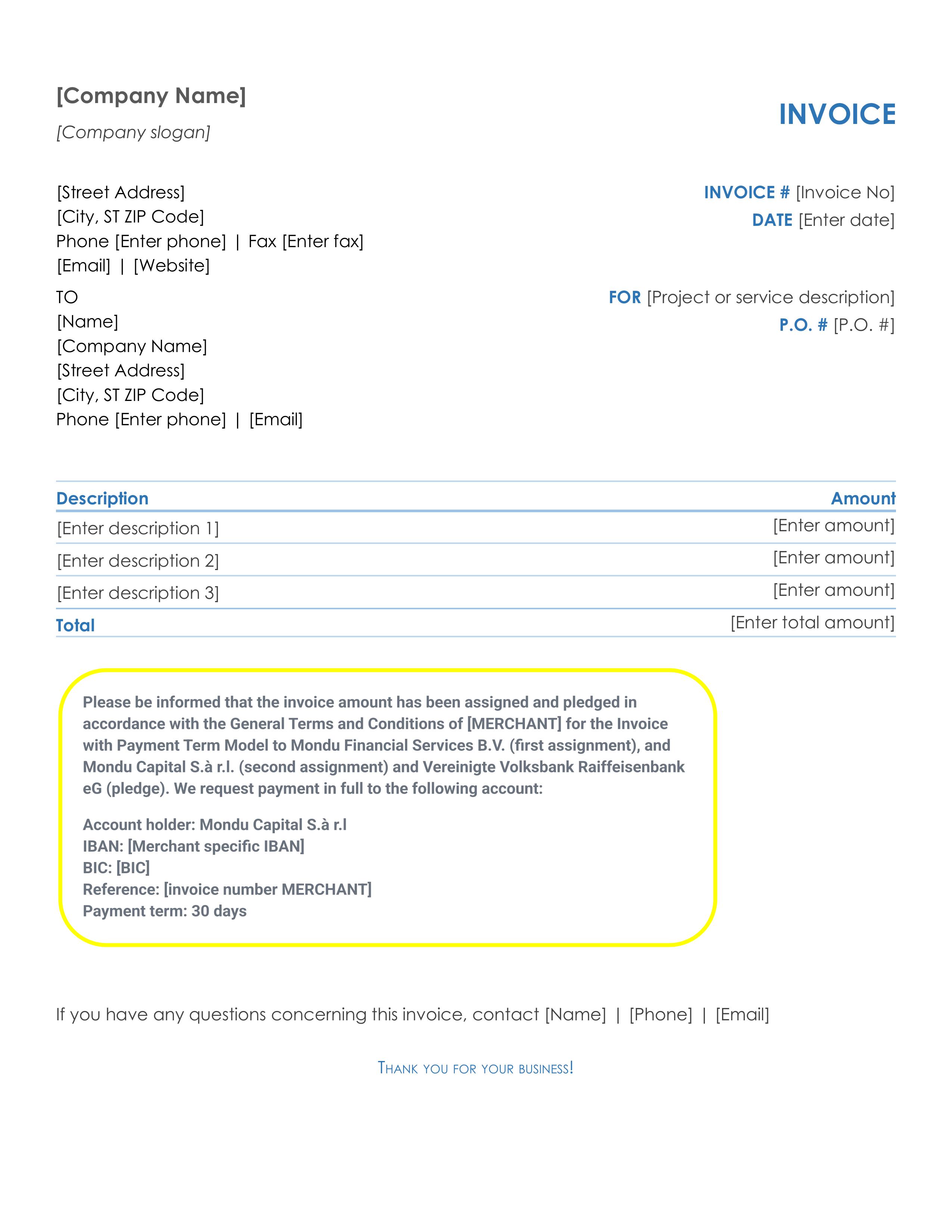 - We also recommend placing our invoice snippet as visibly as possible (using bold font).