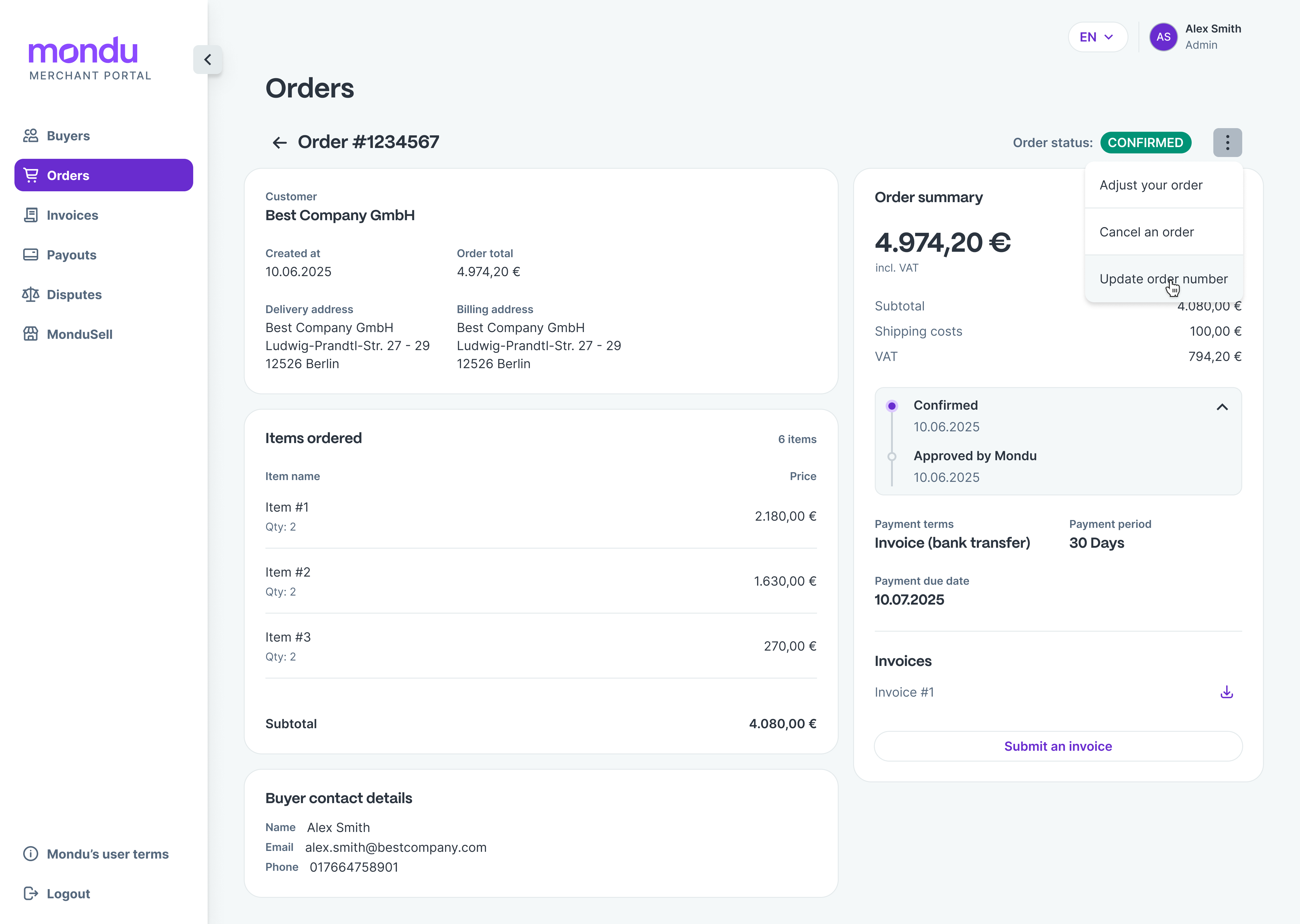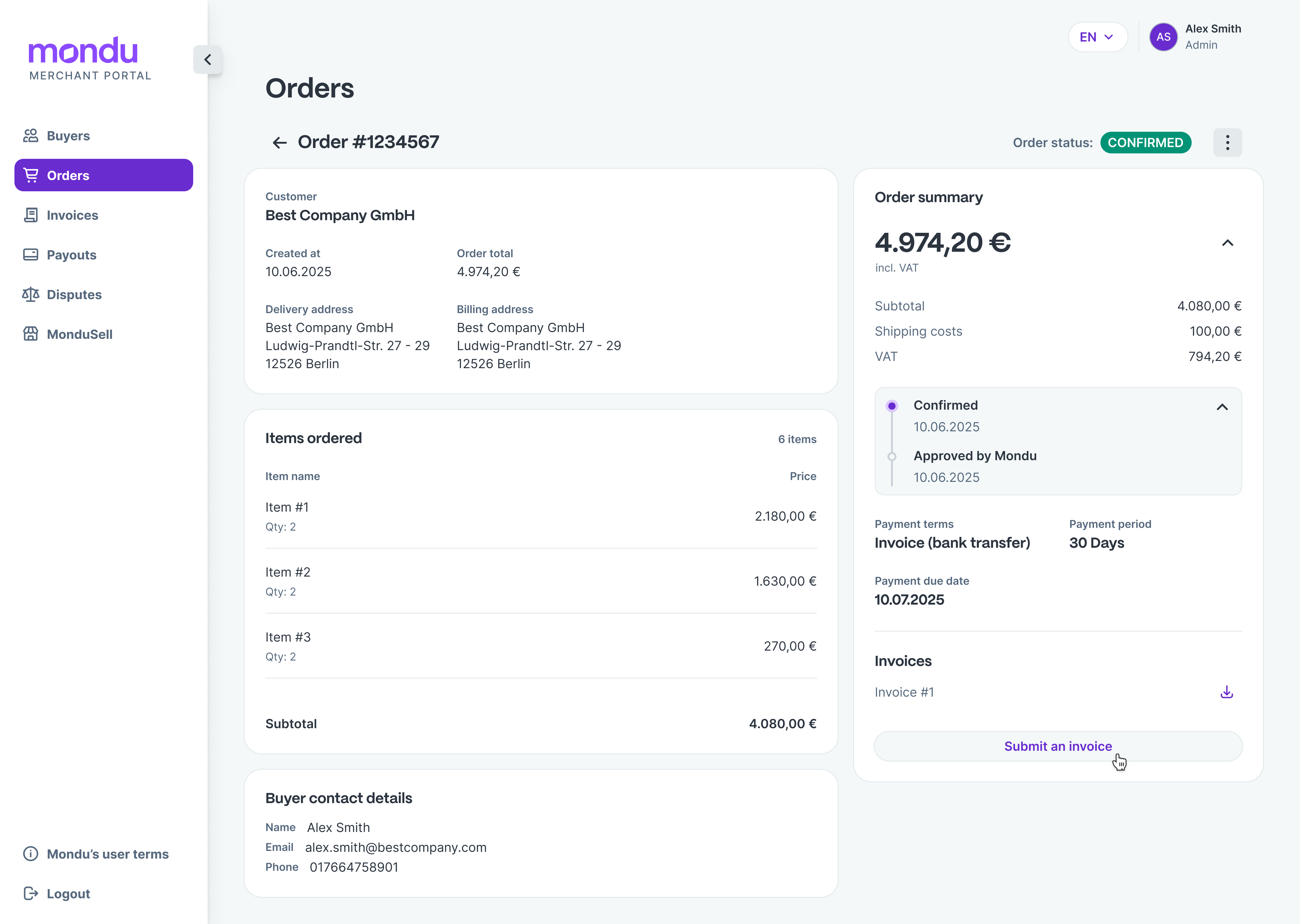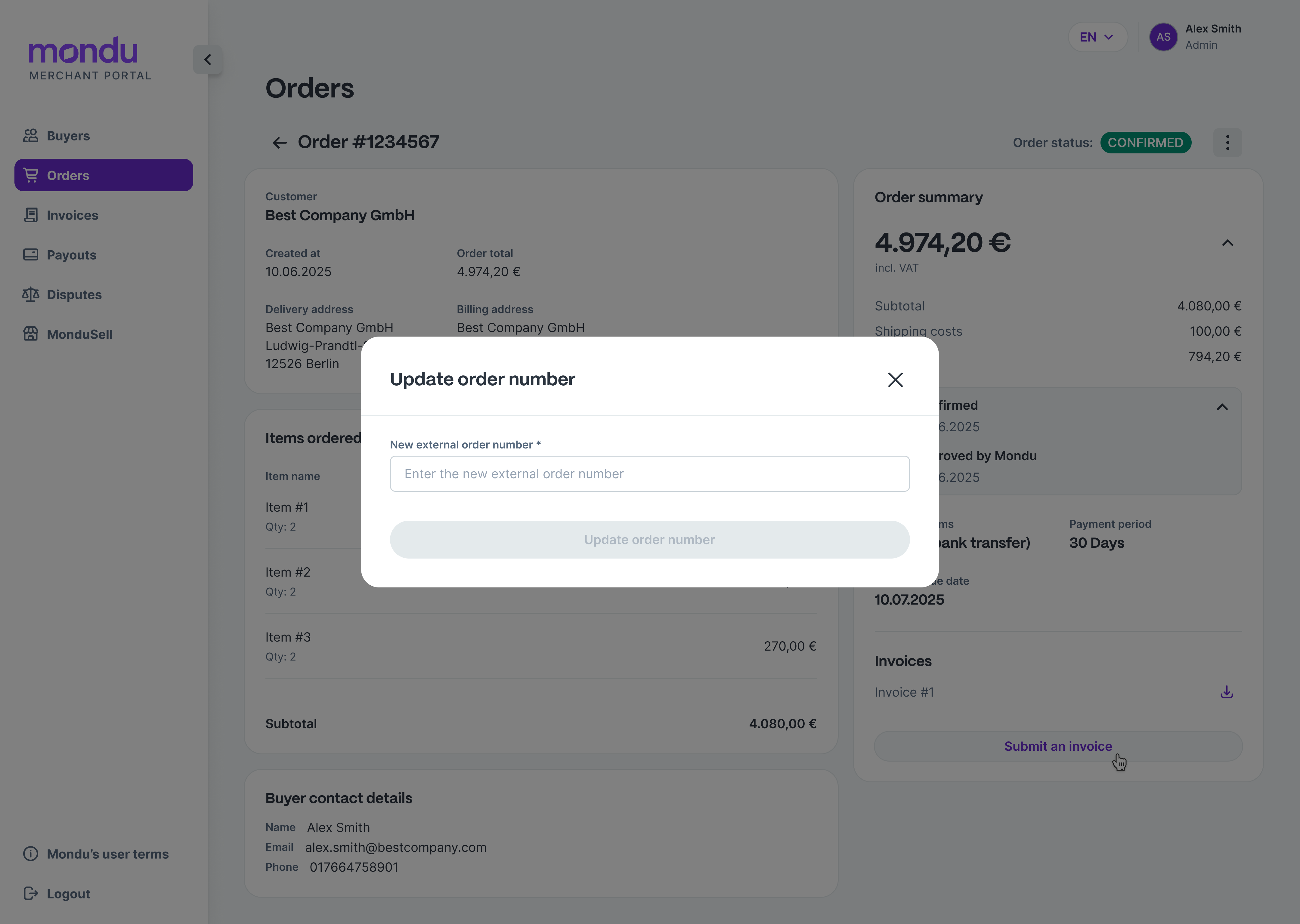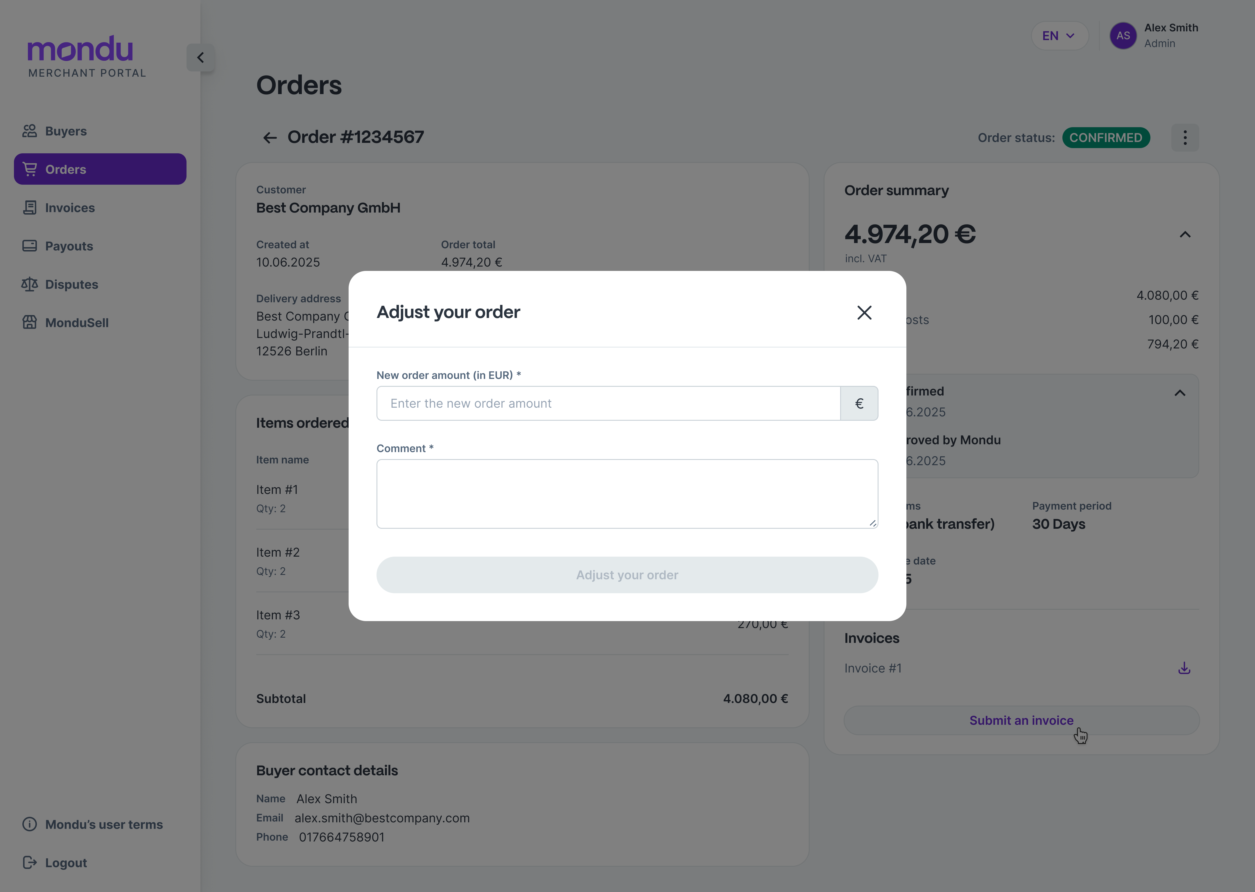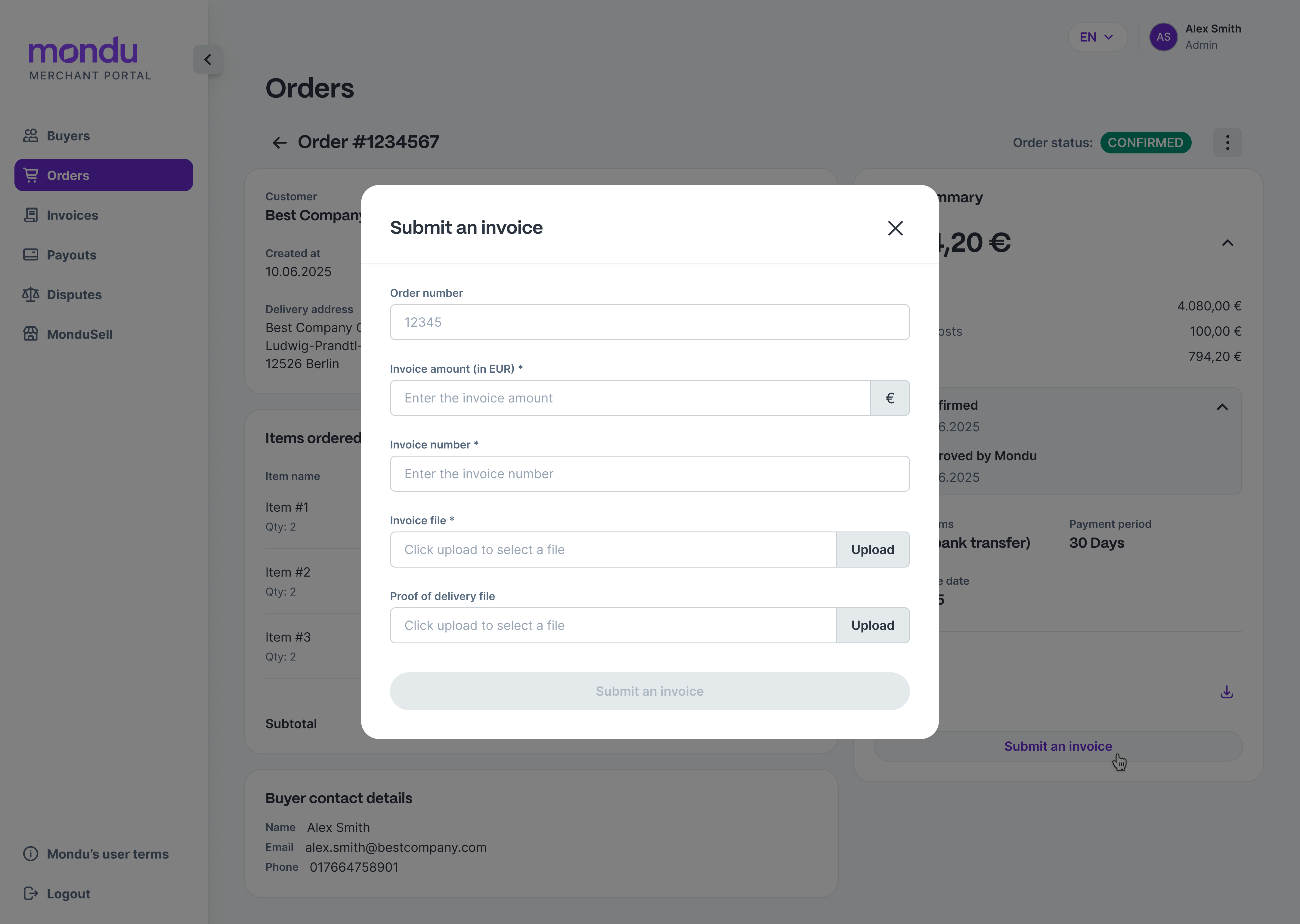 Note: Submitting an invoice triggers the merchant payment. It also starts the customer's payment period with Mondu (e.g., 30 days). The invoice amount must be less than or equal to the order amount. To be able to submit an invoice, the order must have the status "confirmed", "partially shipped", or "partially completed".