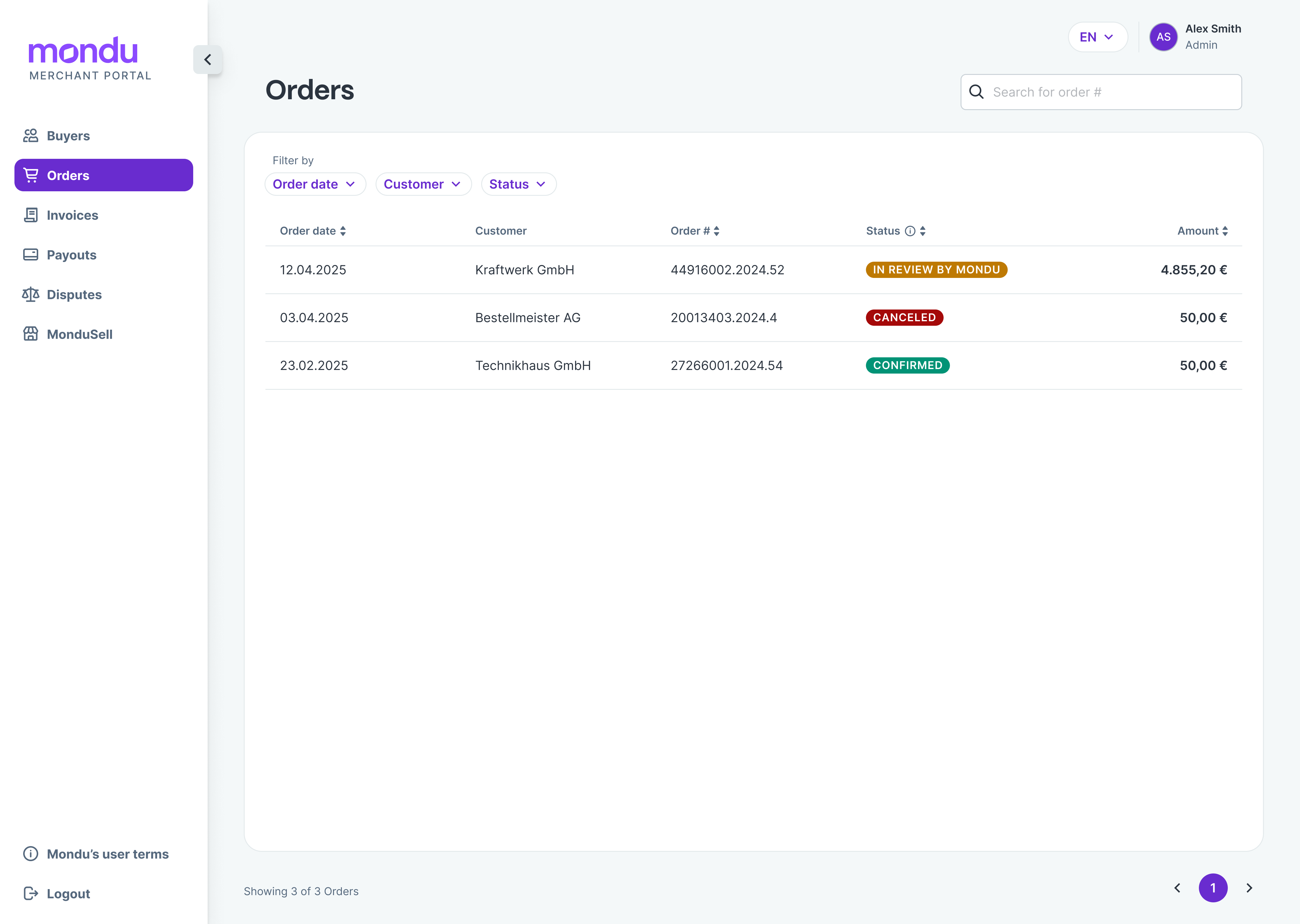 The menu item "Orders" shows you all orders that have been placed via a Mondu payment method. This includes orders from your online shop as well as from MonduSell (Offline).