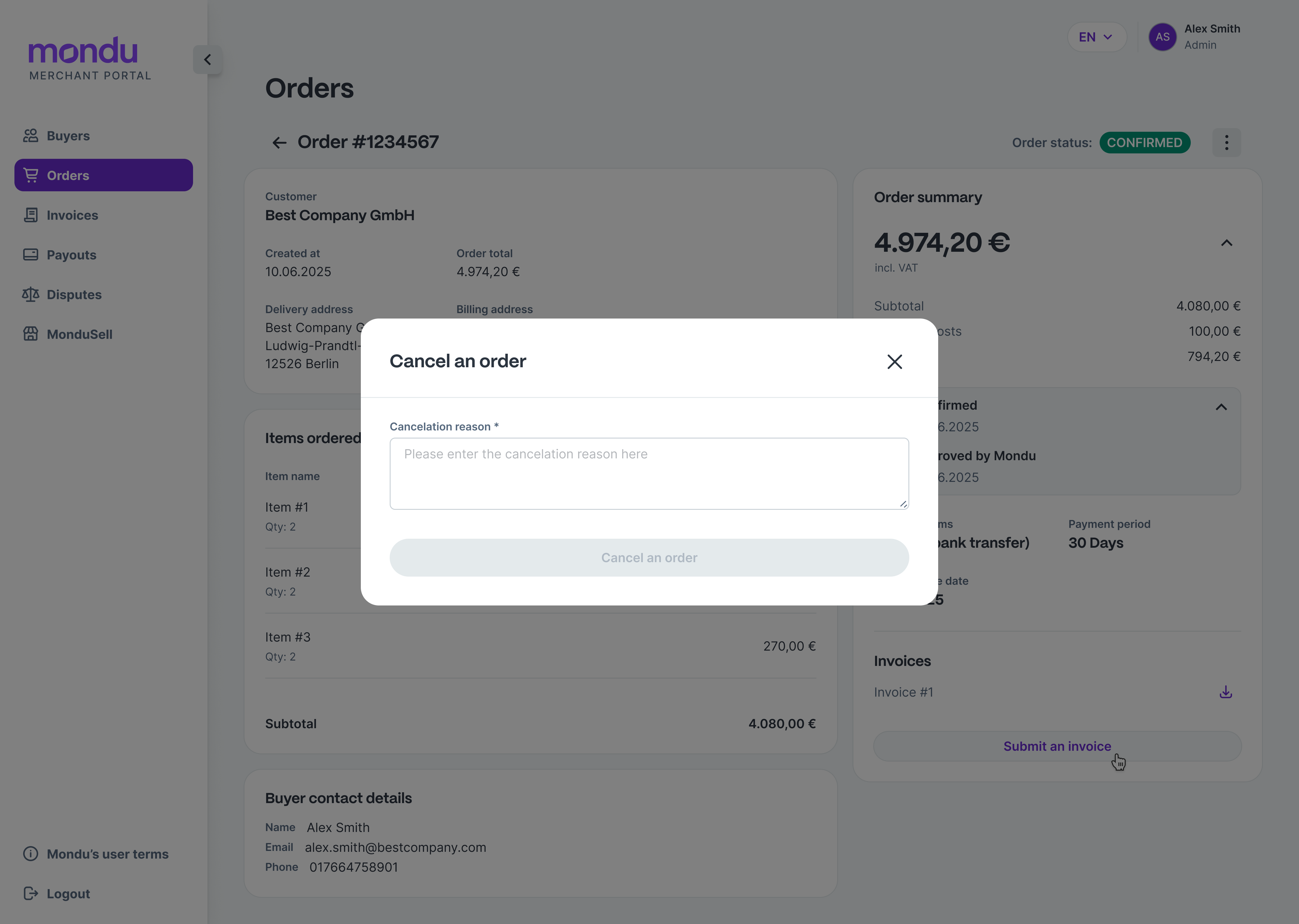 - The order is now completely cancelled and can no longer be processed via Mondu.