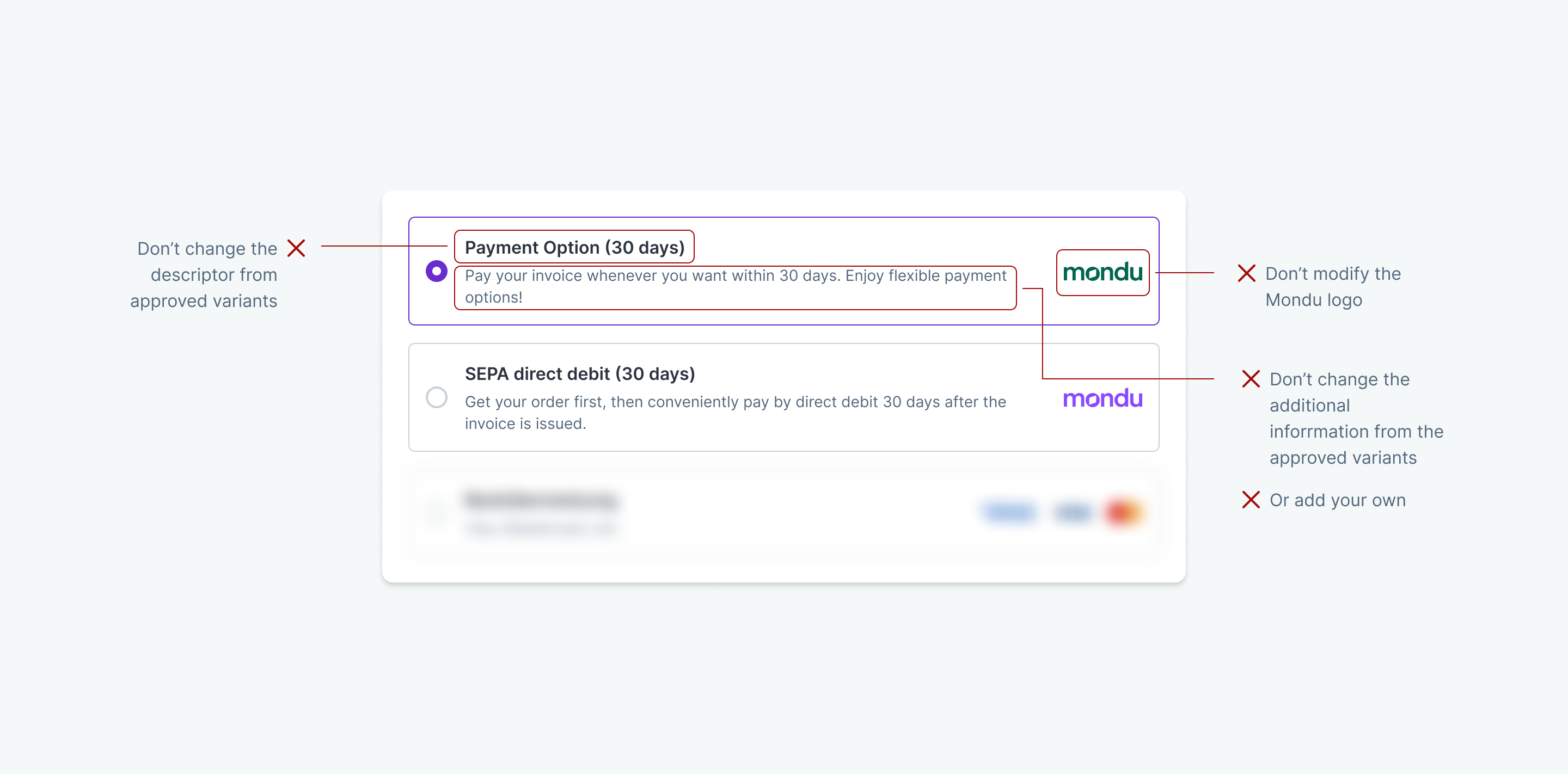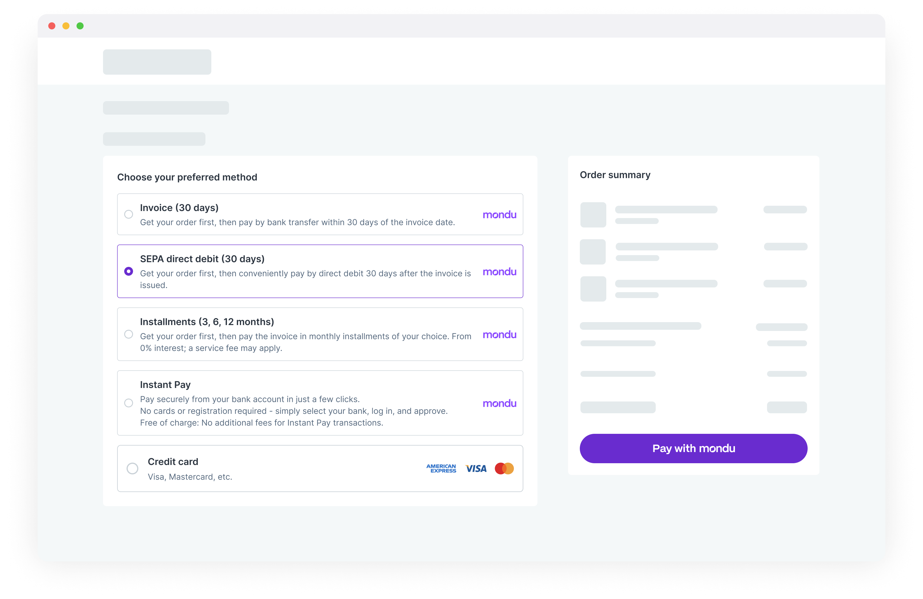 Present the Mondu payment methods in a coherent style with clear names and visuals so that your customers immediately understand what type of payment method it is. The payment method selection is the most important point of contact for converting a shopping basket into a purchase.