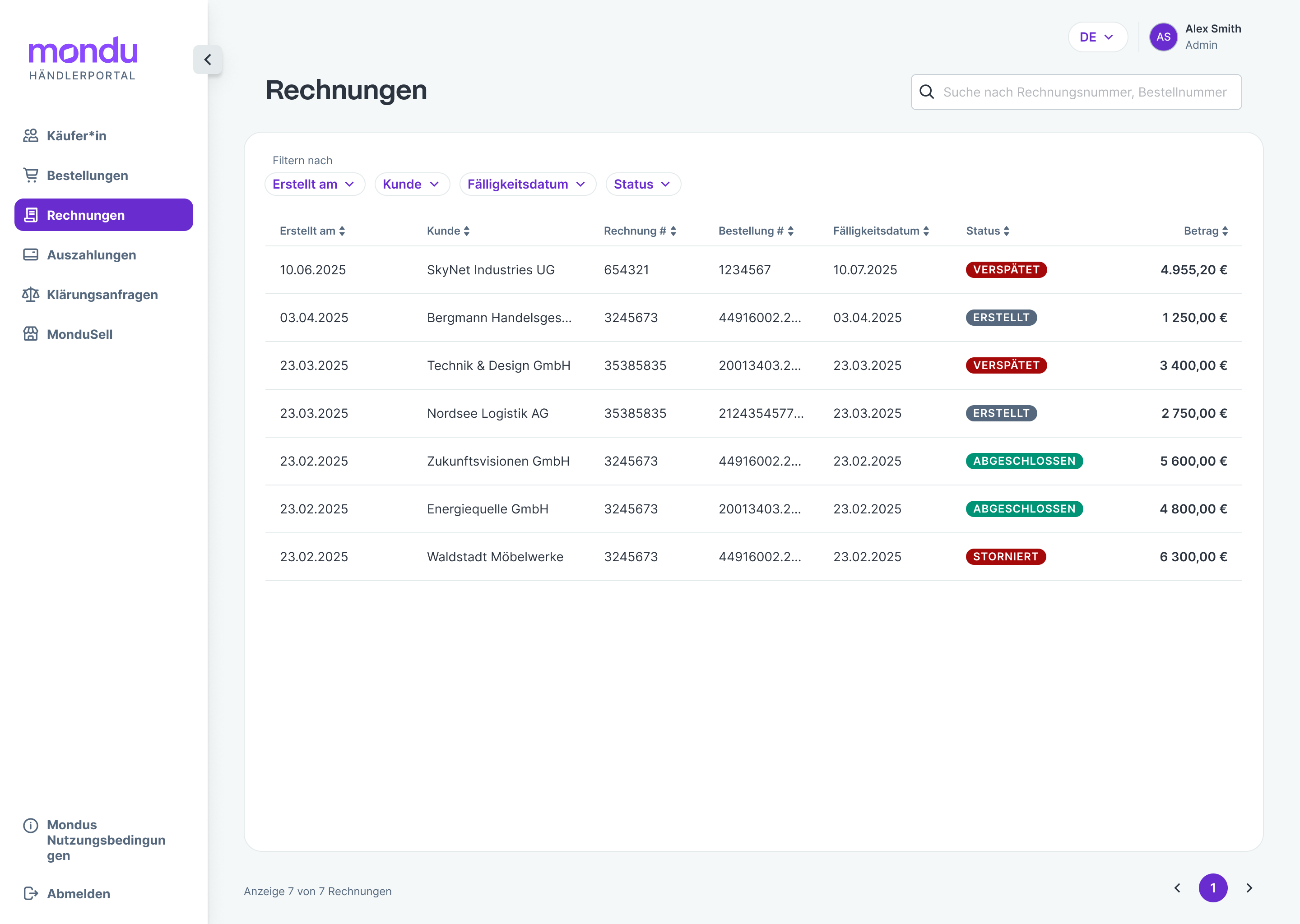 Die Listenansicht umfasst alle an Mondu übermittelten Rechnungen. Die Rechnungen werden chronologisch aufgelistet. Verwenden Sie die Filter, um gezielt nach einer Bestellung, einer Rechnung, einem Kunden, Rechnungsbetrag, Fälligkeitsdatum oder Status zu suchen.