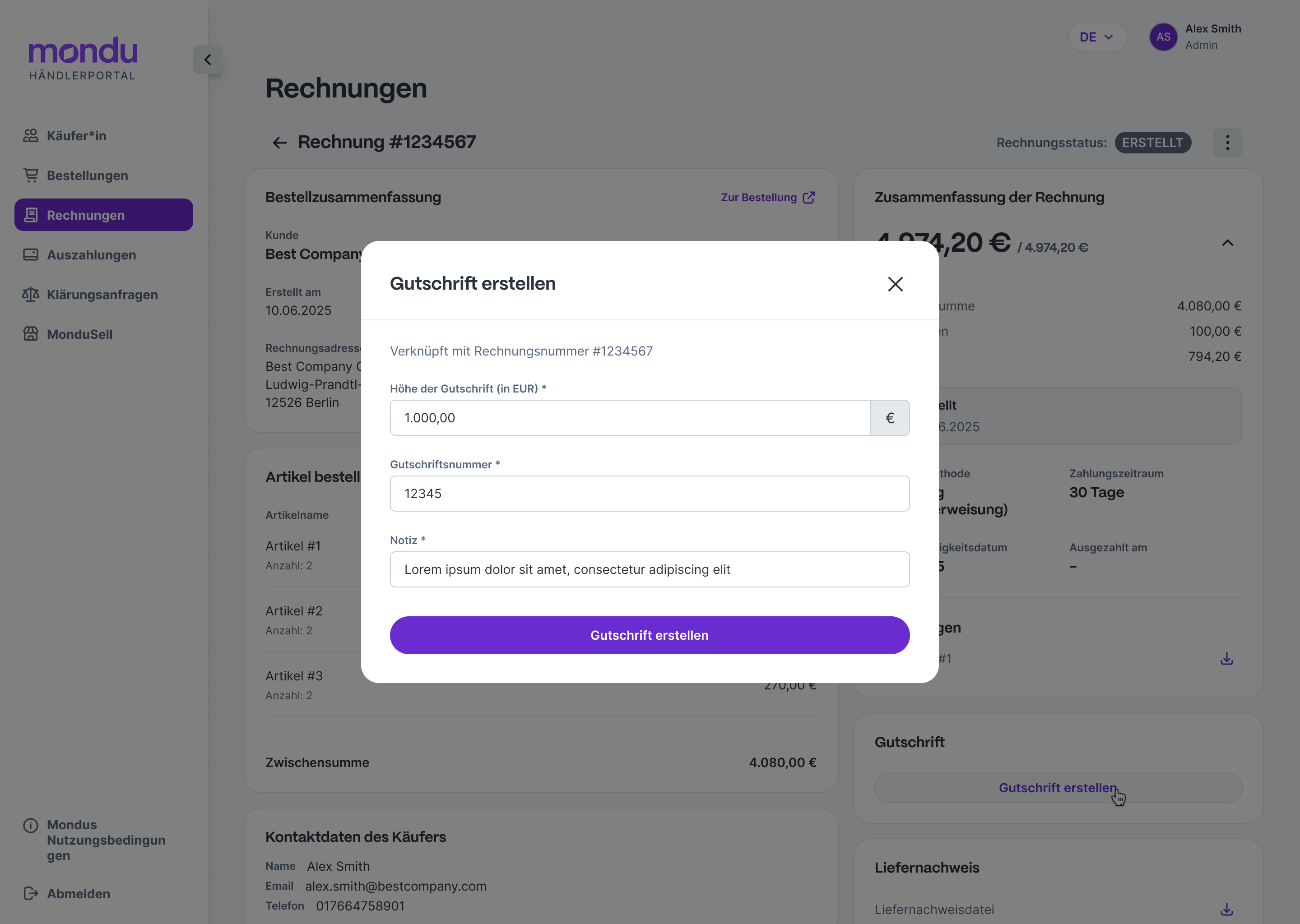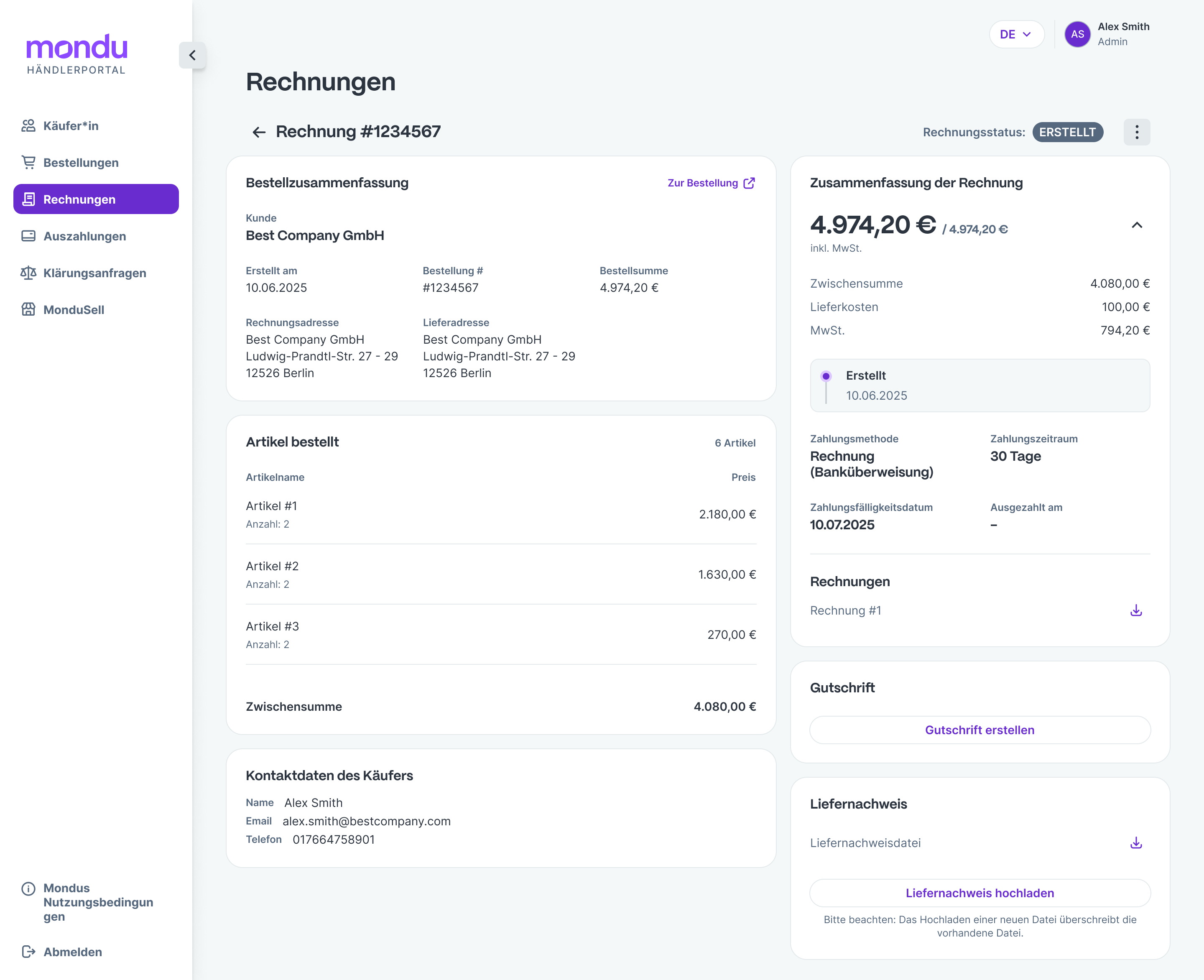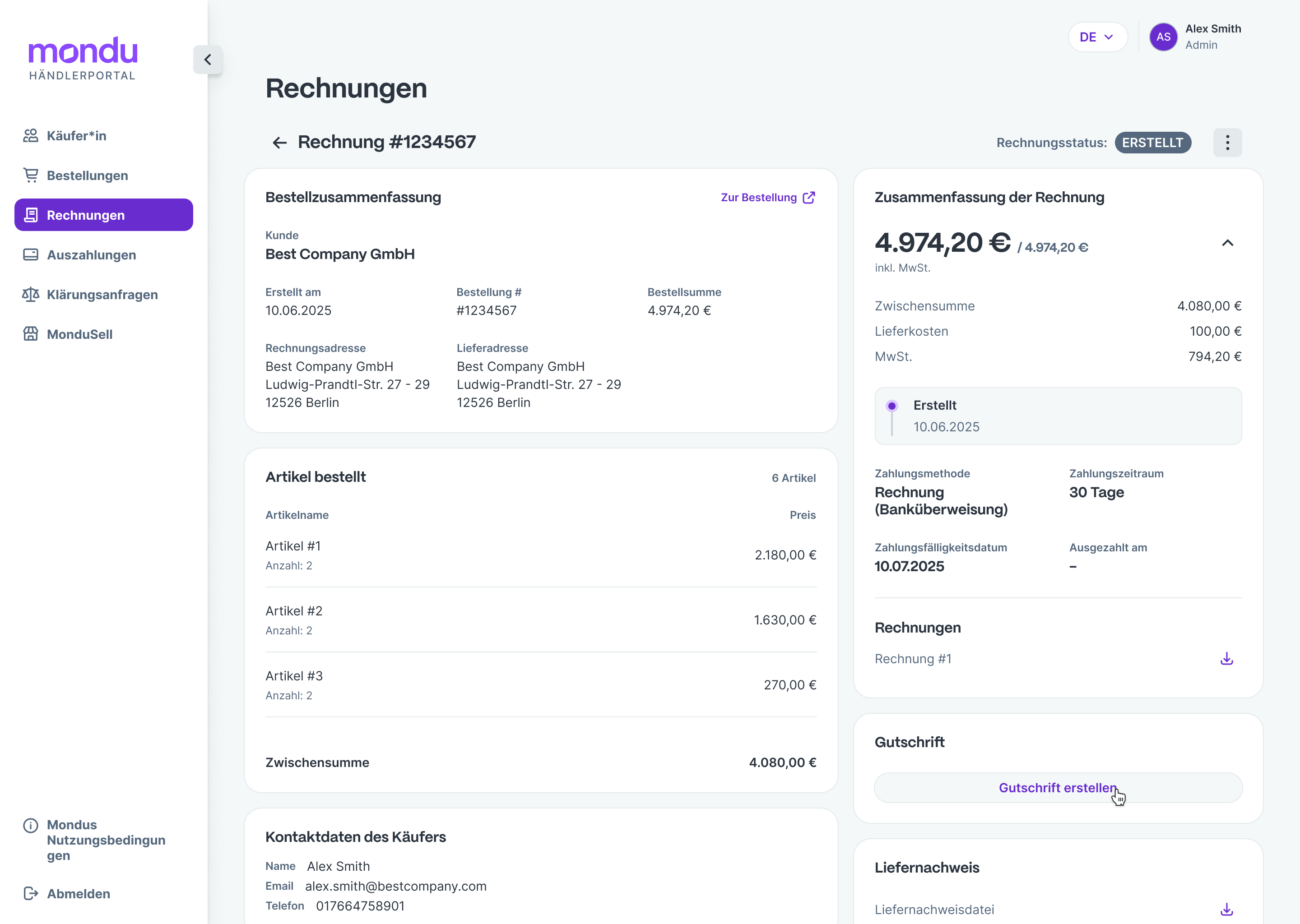 Dort erhalten Sie einen Einblick in die Rechnungsdetails, den Zahlungsstatus, eingereichte Gutschriften sowie den Zahlungsstatus des Kunden bei Mondu.
