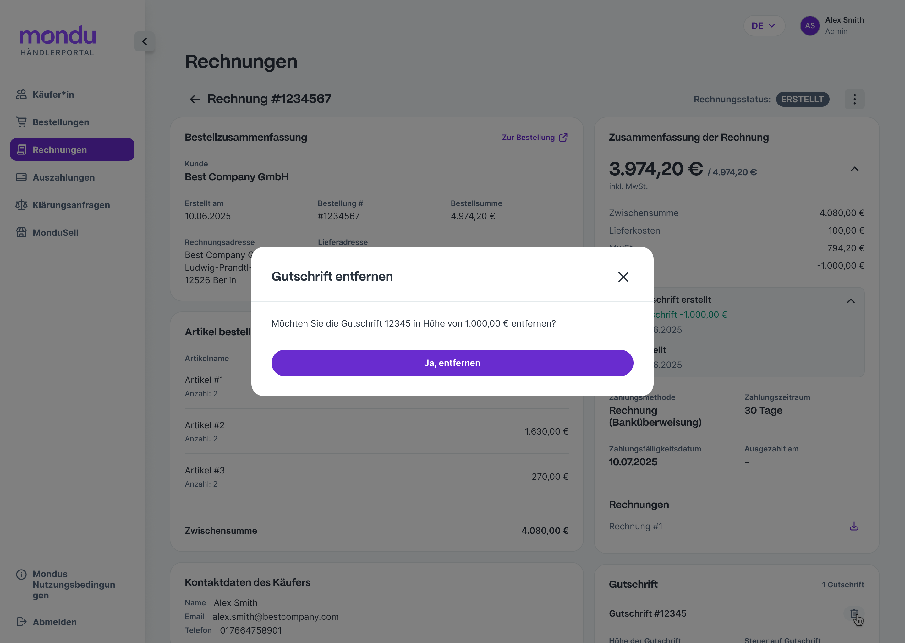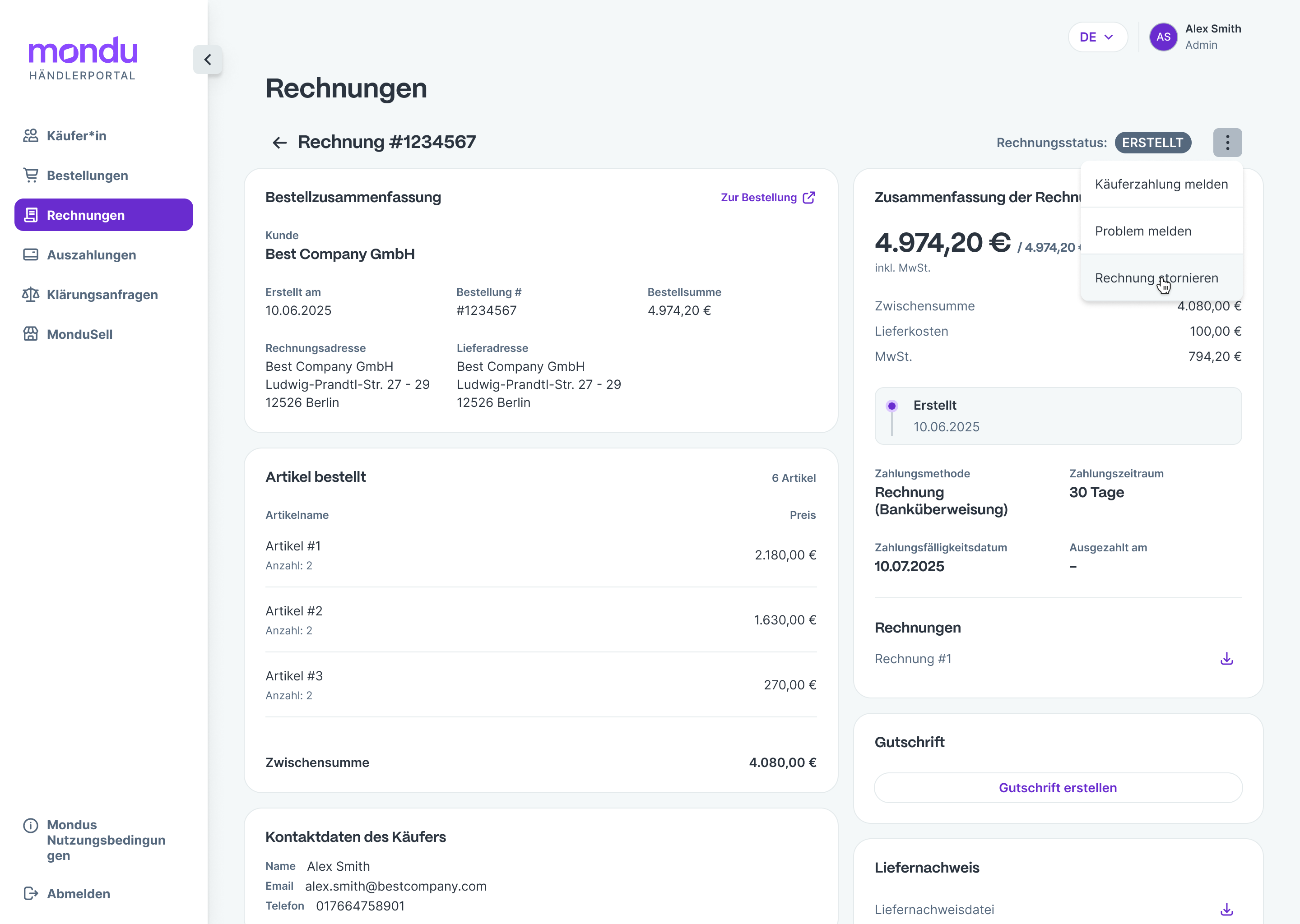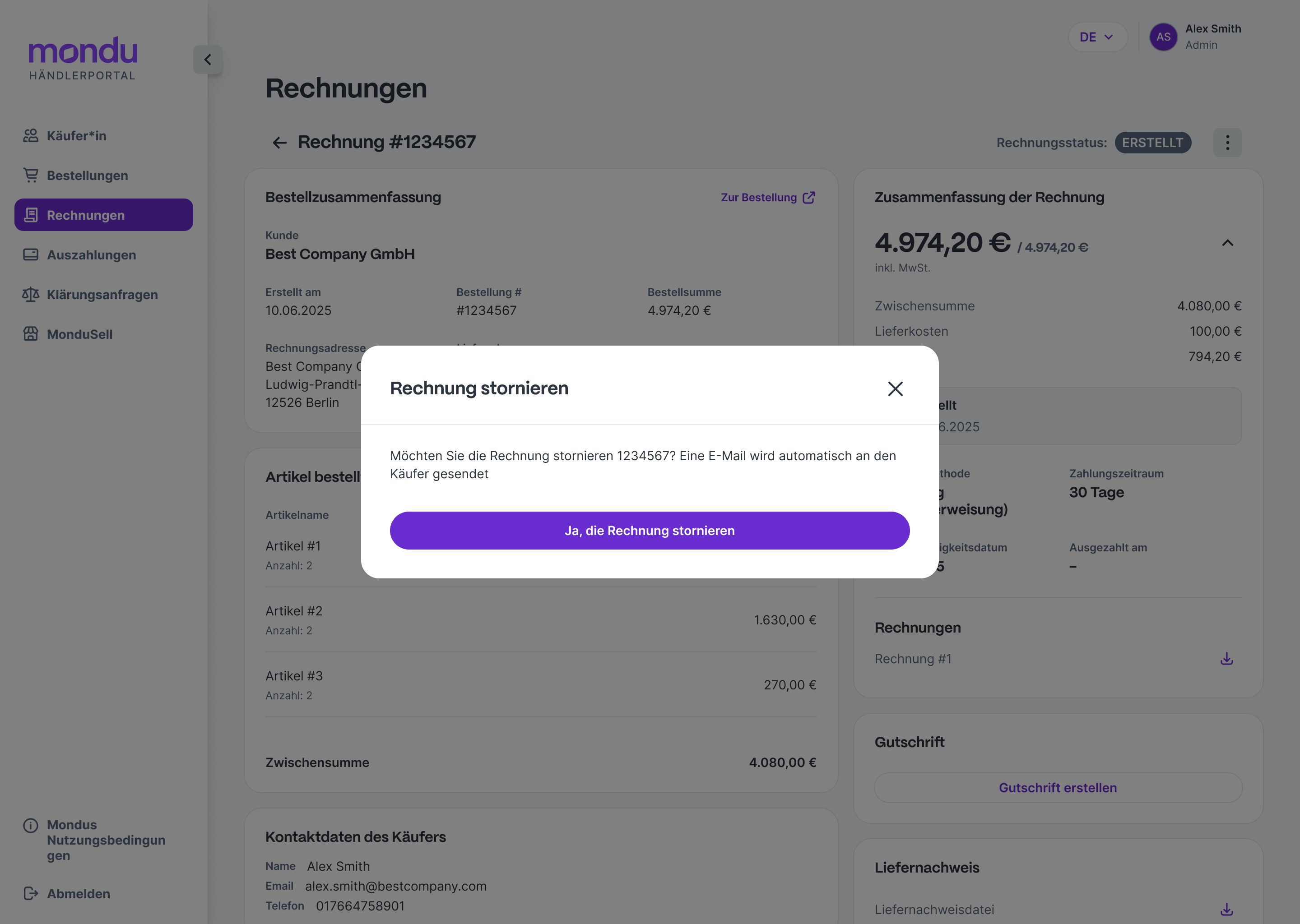 Hinweis: Eine Rechnung kann nicht storniert werden, wenn die Zahlung an den Händler bereits erfolgt ist oder der Käufer eine Zahlung an Mondu geleistet hat.