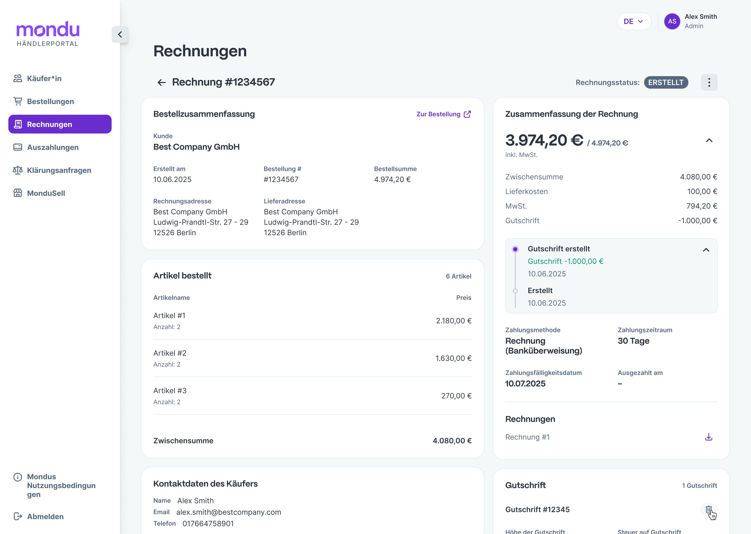 Sie erhalten einen Einblick in die Rechnungsdetails, eingereichte Gutschriften sowie den Zahlungsstatus der Kunden. Sie haben auch die Möglichkeit, eine Rechnung manuell zu stornieren oder eine Gutschrift einzureichen.
