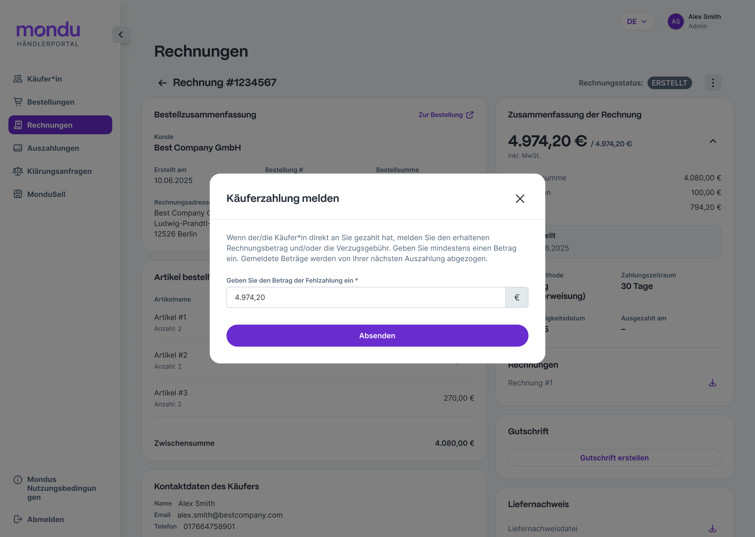 Wenn ein Käufer die Zahlung direkt an Sie anstatt an Mondu geleistet hat, können Sie dies über das Mondu-Portal melden: